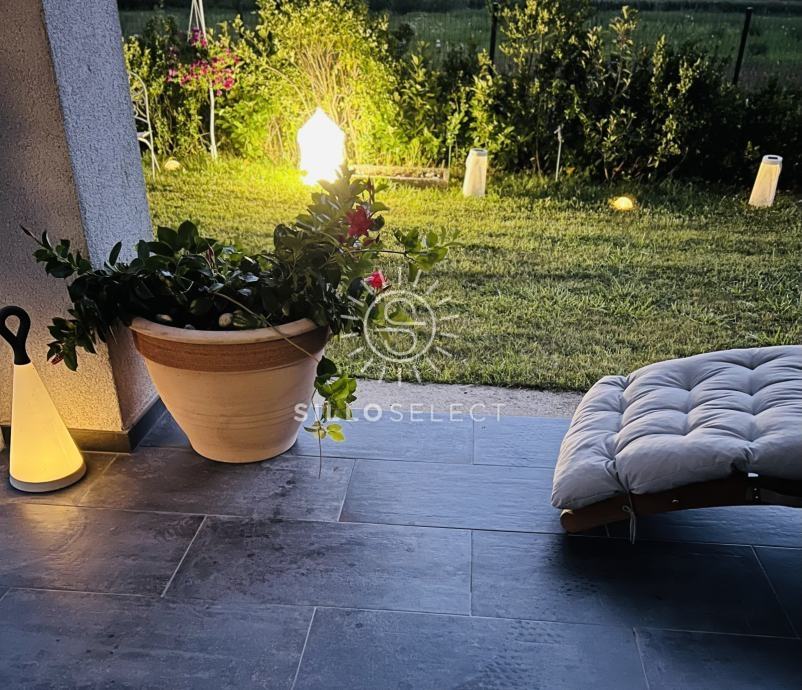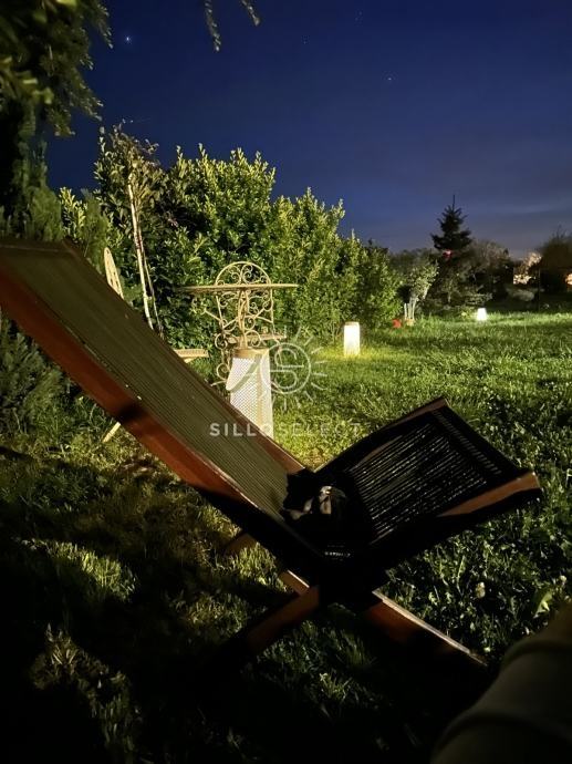 Prostrano dvorište: Parcela od 750 m2 s raznolikim zelenilom, uključujući travnjak, voćke, borove, cedrove i lavandu, stvara miran i ugodan ambijent.
