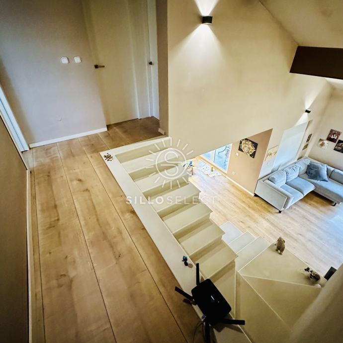 Prizemlje: Ulazni hodnik vodi u prostrani dnevni boravak(30m2) s visokim stropom (do 6 metara). Kamin (8 kW) grije praktički cijelu kuću. Kuhinja je moderna i odvojena od dnevnog boravka. U prizemlju su također još 2 sobe od cca 8m2 i kupaonica, kao i natkrivena terasa površine 12m2 gdje se se također može ulaziti/izlaziti u/iz kuću/e