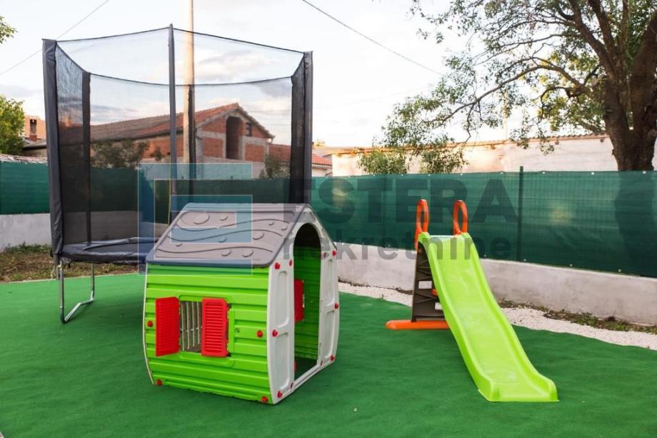 Dvorište je veliko i dobro održavano te je potpuno ograđeno od okolice a krasi ga veliki bazen sa vanjskim tušem, sunčalište sa ležaljkama i dječje igralište.