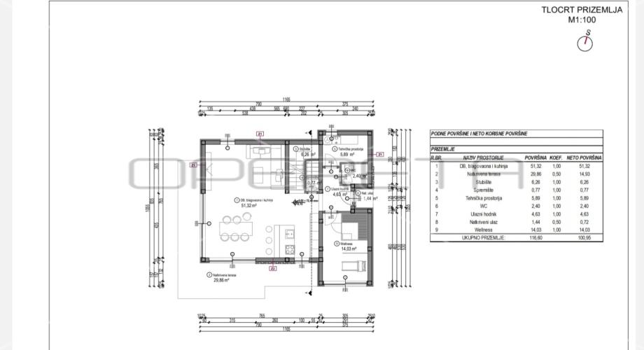 Prizemni prostor ove kuće sjedinjuje dnevni boravak, kuhinju i blagovaonicu u jedan prostrani otvoreni prostor. Osim toga, u prizemlju se nalazi jedna prekrasna spavaća soba, WC i tehnička soba.