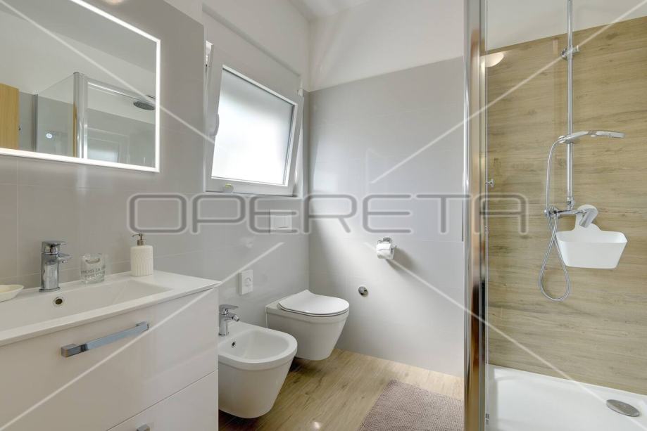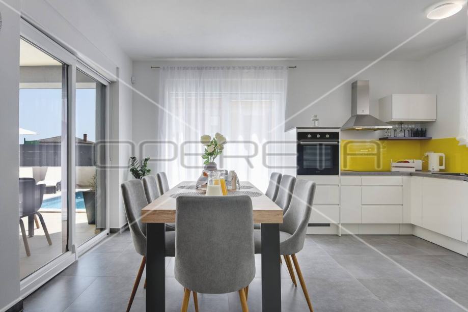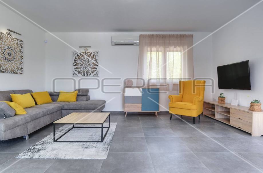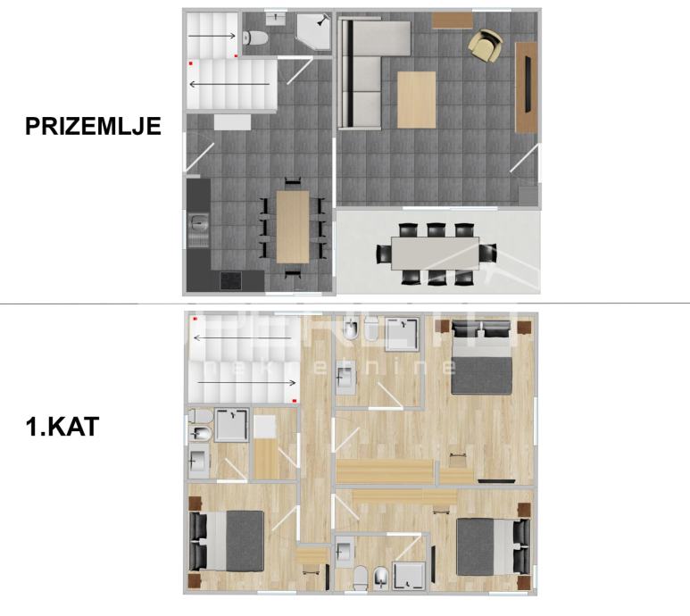 u prizemlju se nalazi dnevni boravak sa izlazom na terasu, kuhinja i blagovaonica sa izlazom na natkrivenu terasu i kupaonica.