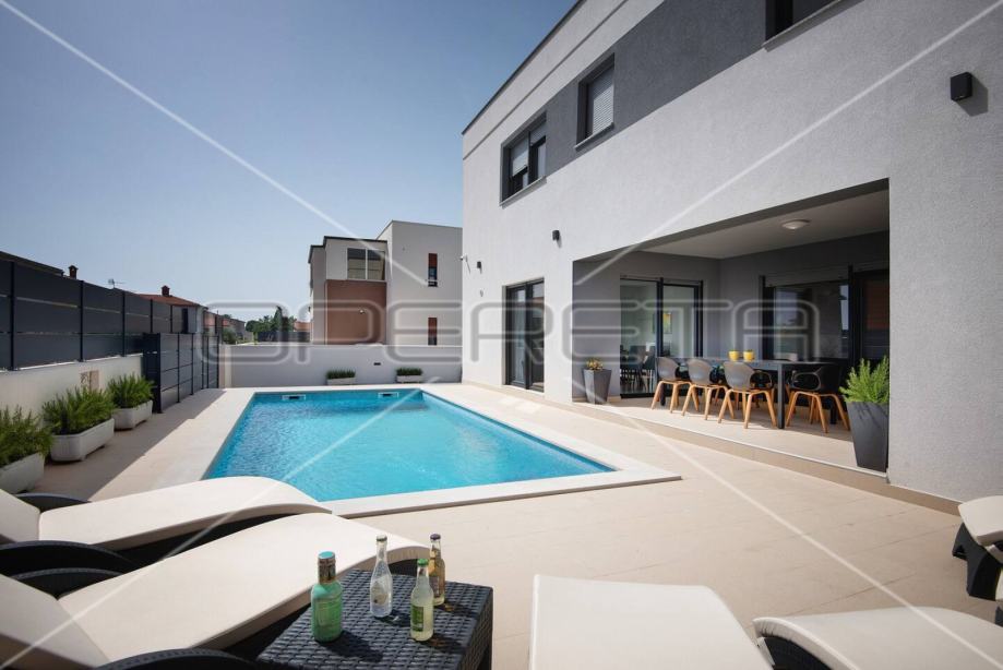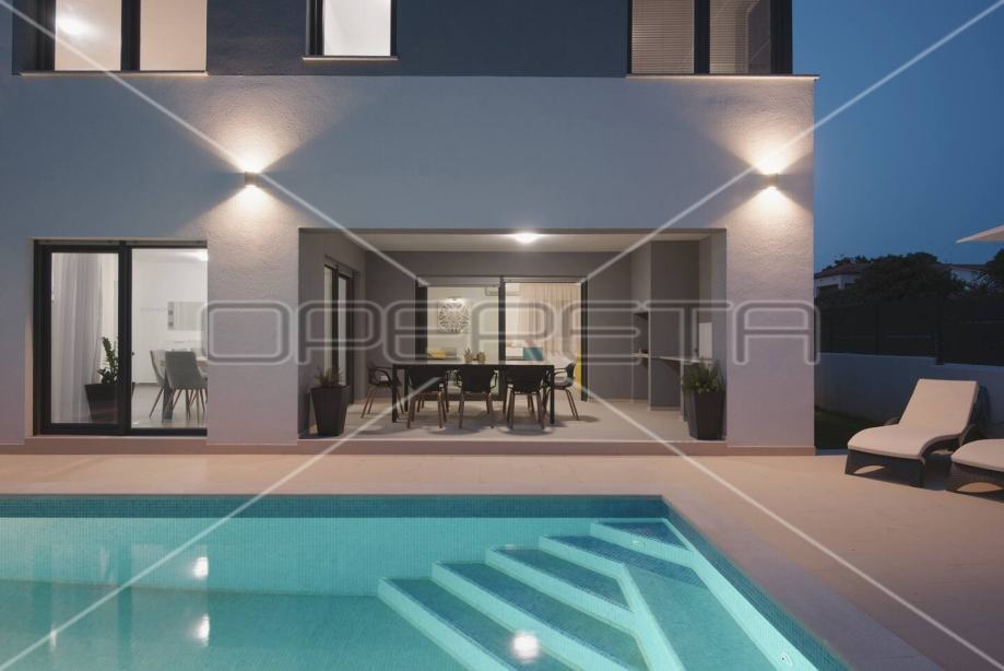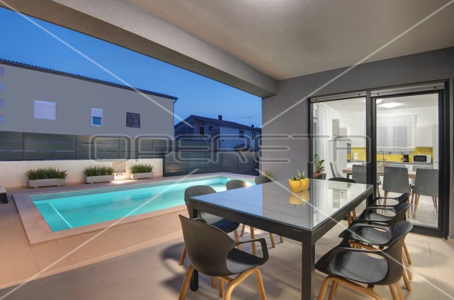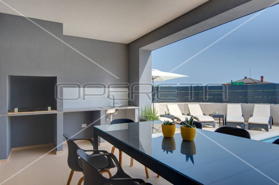 Vanjski dio je lijepo uređen, te u potpunosti ograđen a uključuje: predivan bazen od 32 m2 sa sunčalištem tik do terase, na terasi ljetna kuhinja sa zidanim roštiljem za potpuni komfor i uživanje.