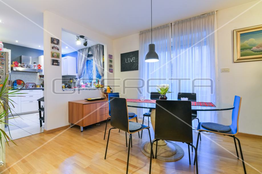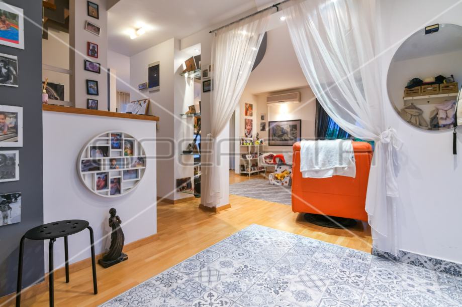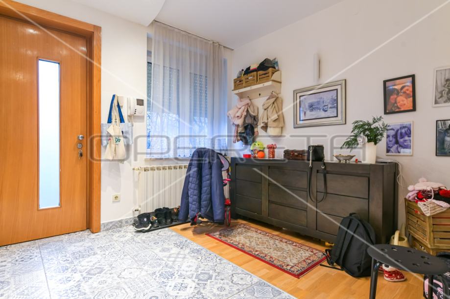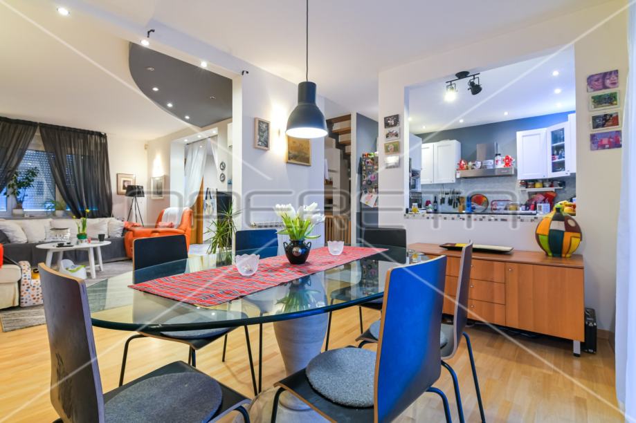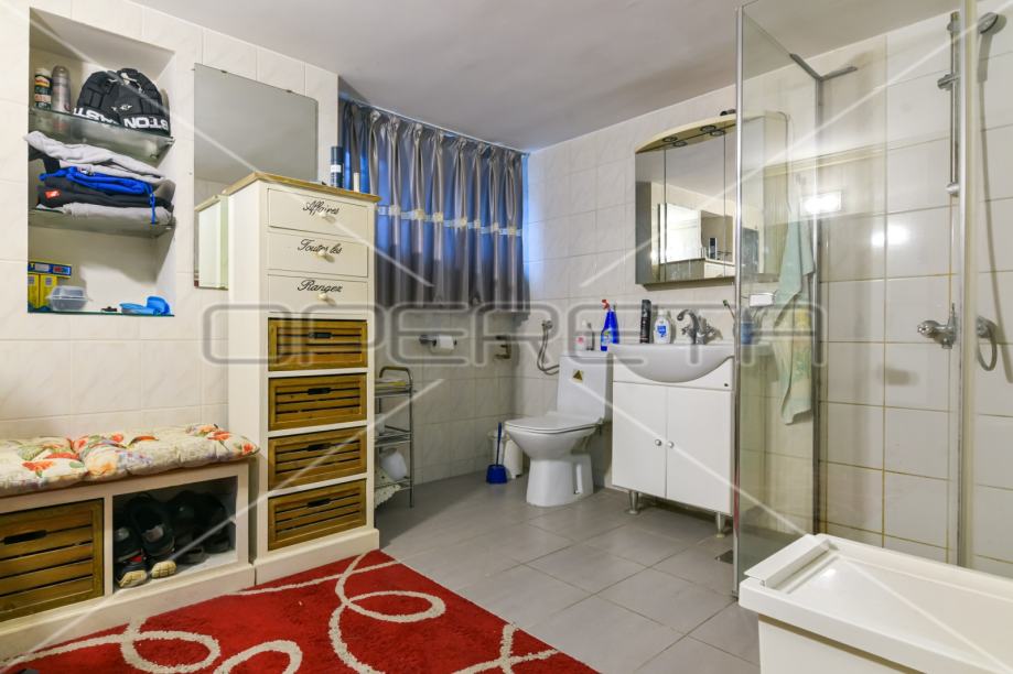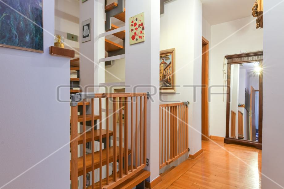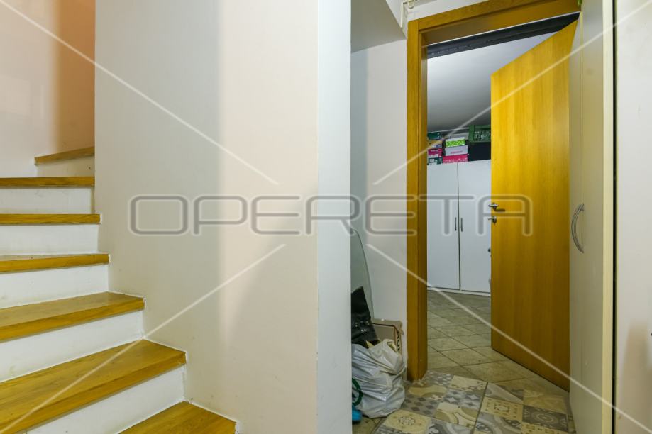 Kuća se sastoji od podrumskog dijela gdje se nalazi kotlovnica i kupaonica sa sanitarnim čvorom, u prizemlju se nalazi ulazni dio, open space dnevni boravak sa blagovaonicom i kuhinjom iz kojih se izlazi na terasu, na prvom katu se nalaze 3 spavaće i kupaonica i na zadnjoj etaži je tavanski prostor koji se trenutačno koristi kao ured.