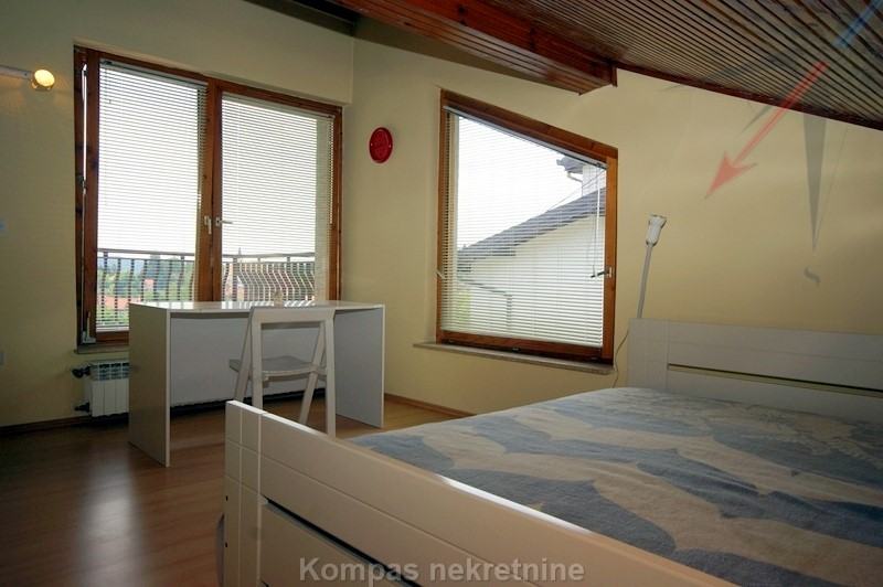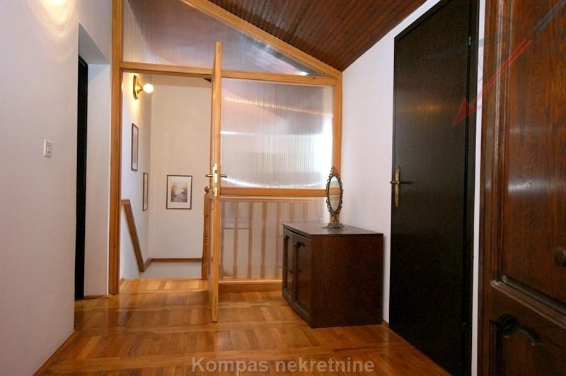 PRVI KAT: hodnik iz kojeg se dolazi u sve prostorije, kuhinja, blagovaona, veliki dnevni boravak, dvije spavaće sobe, djelomično natkrivena terasa ( 45 m² ) sa tri strane kuće, s pogledom na samoborski trg.