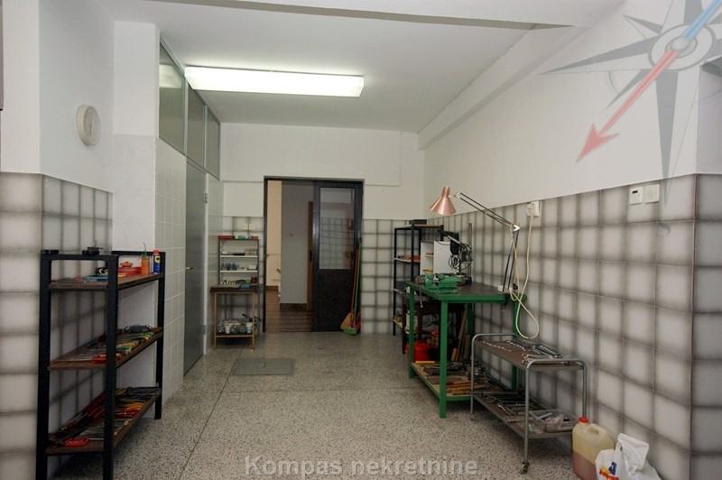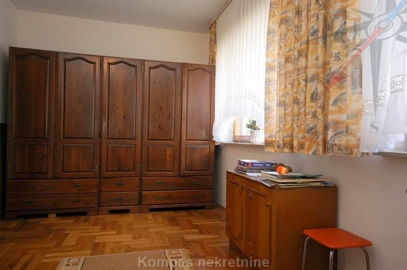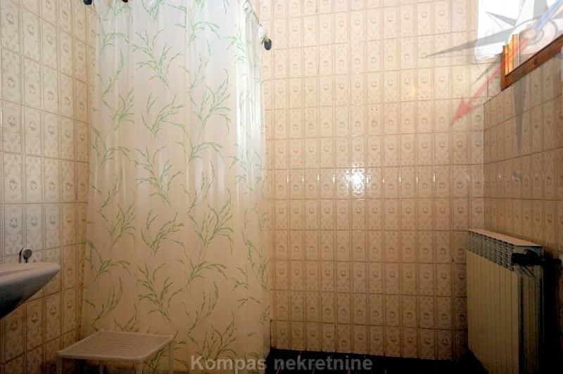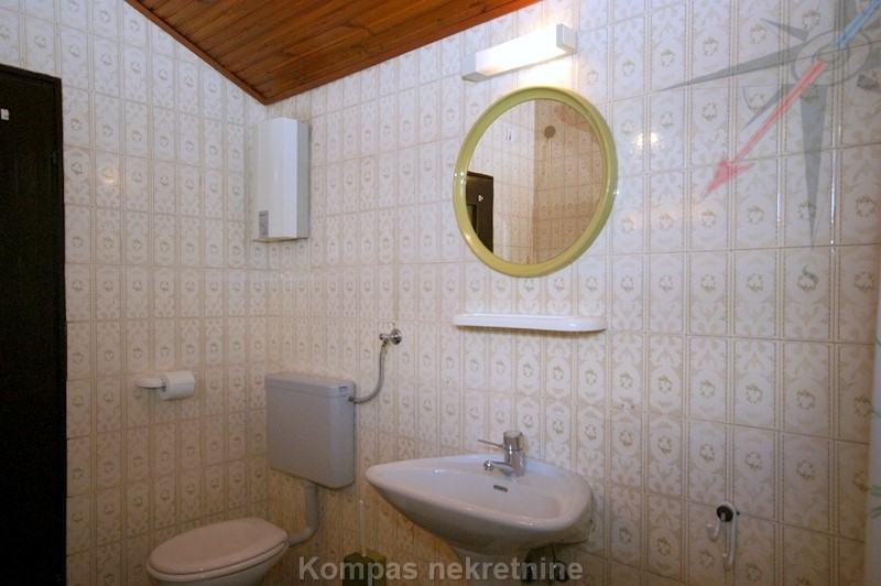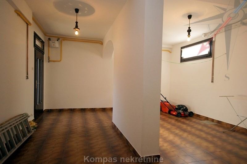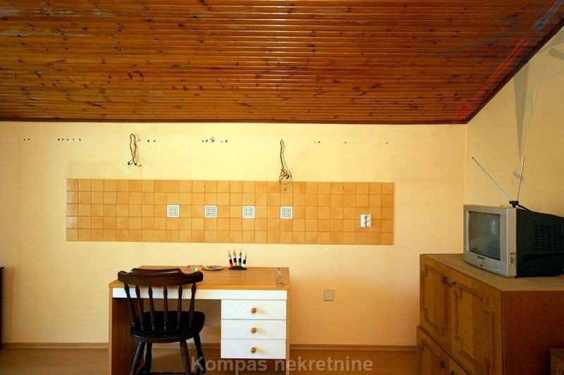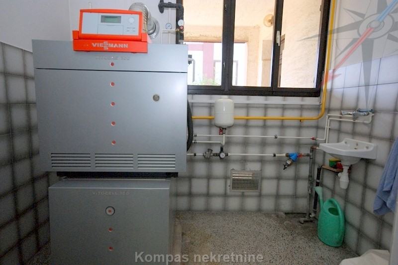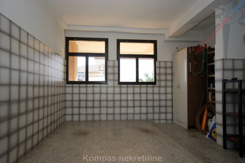 PRIZEMLJE: uređen stan ( 55 m² ) koji se sastoji od kuhinje, kupaonice, tri sobe. Ima poseban vanjski ulaz, grijanje na strujne radijatore, klima uređaj. Pored stana je garaža s malom radionicom, kotlovnica, spremište s izlazom na natkrivenu terasu od 30 m².