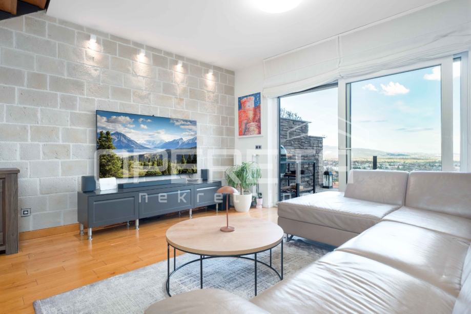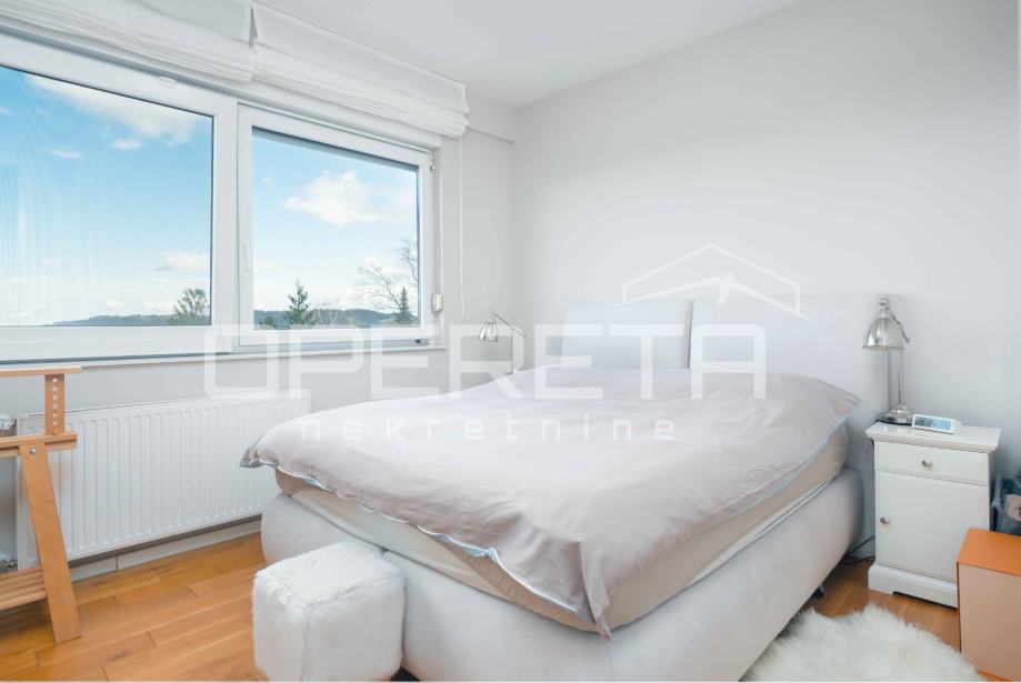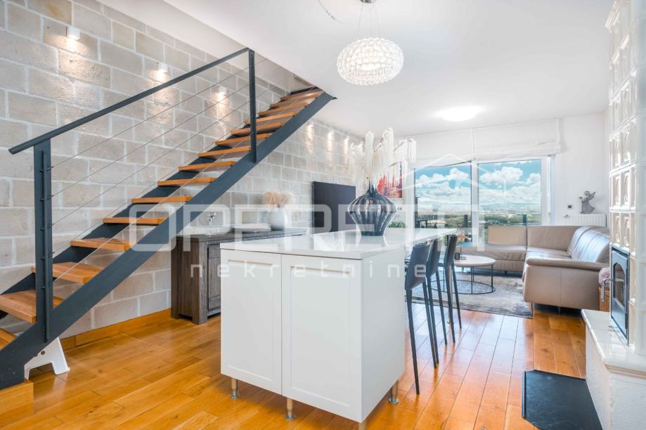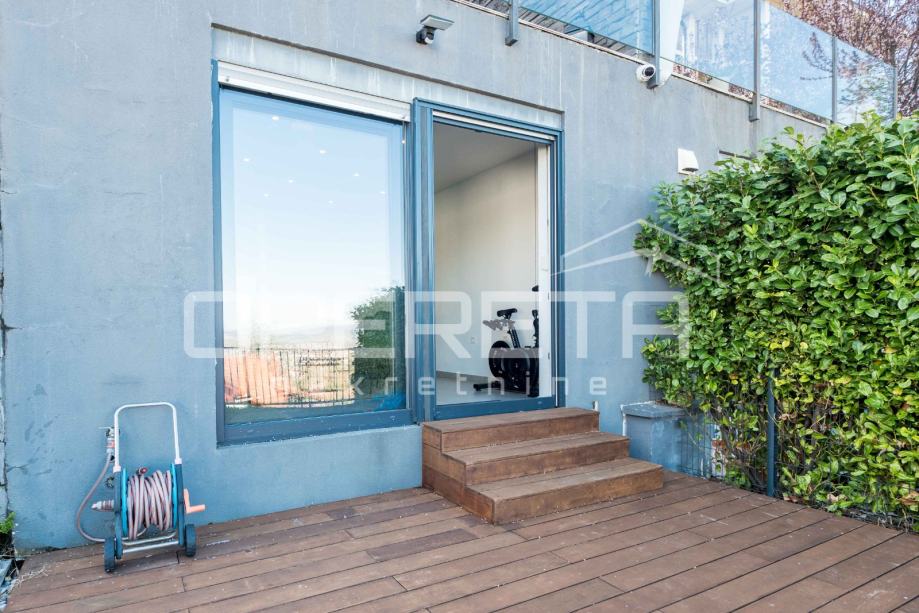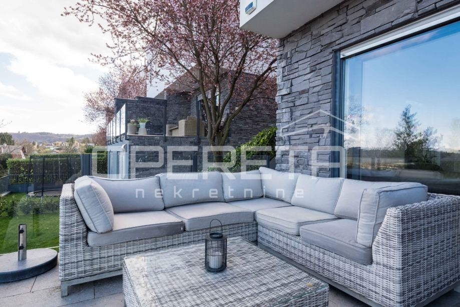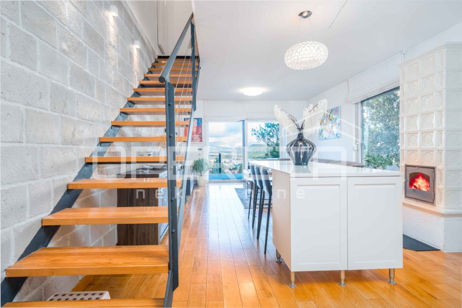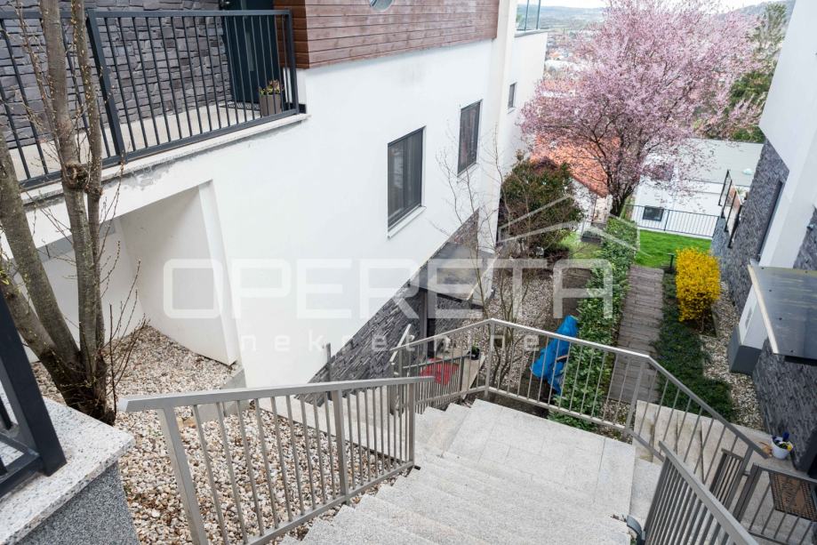 U podrumskoj etaži, koja može funkcionirati zasebno kao cjelina, smješten je dnevni boravak sa izlazom na vrt od 130 m2, spavaća soba, kuhinja, vešeraj, spremište i izba. U prizemnoj etaži se nalazi lijepi dnevni boravak sa blagovaonicom koji ima izlaz na terasu sa koje se pruža lijepi pogled prema Zagrebu i okolici, kuhinjom, kupaonom i ulaznim prostorom. Na katu su smještene 3 komotne spavaće sobe i kupaonica. Posjeduje vanjsko parkirno mjesto i garažno parkirno mjesto. Idealan za obitelj i one koje traže mir nadomak svih potrebnih sadržaja za život.