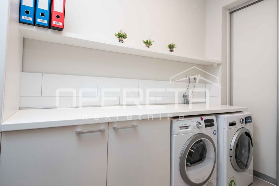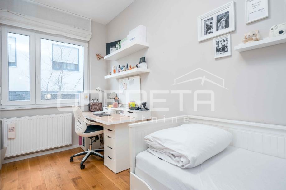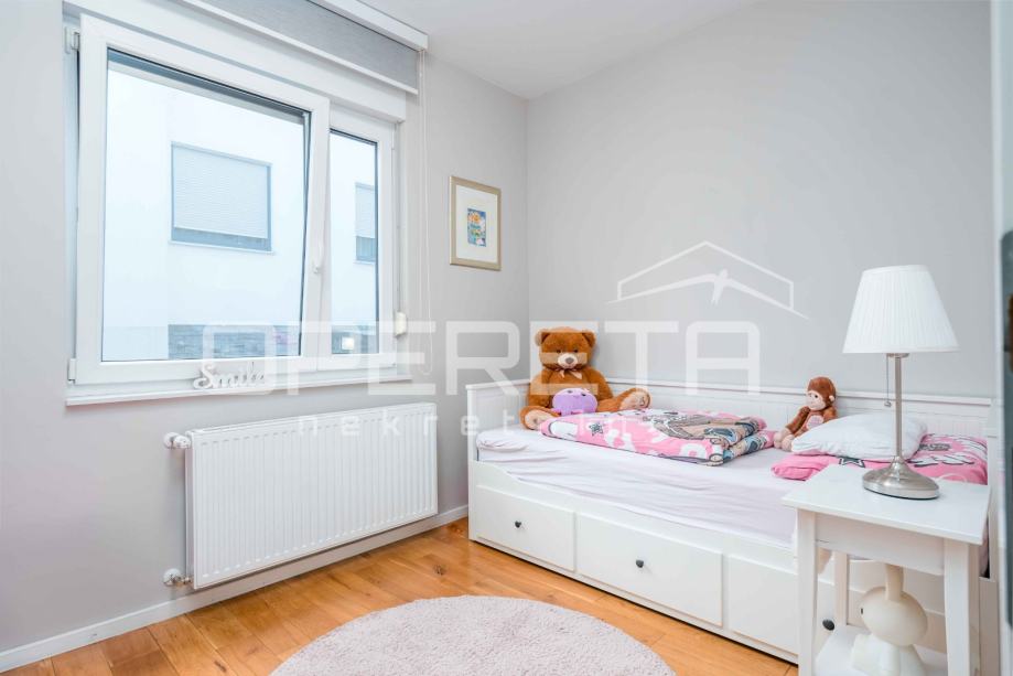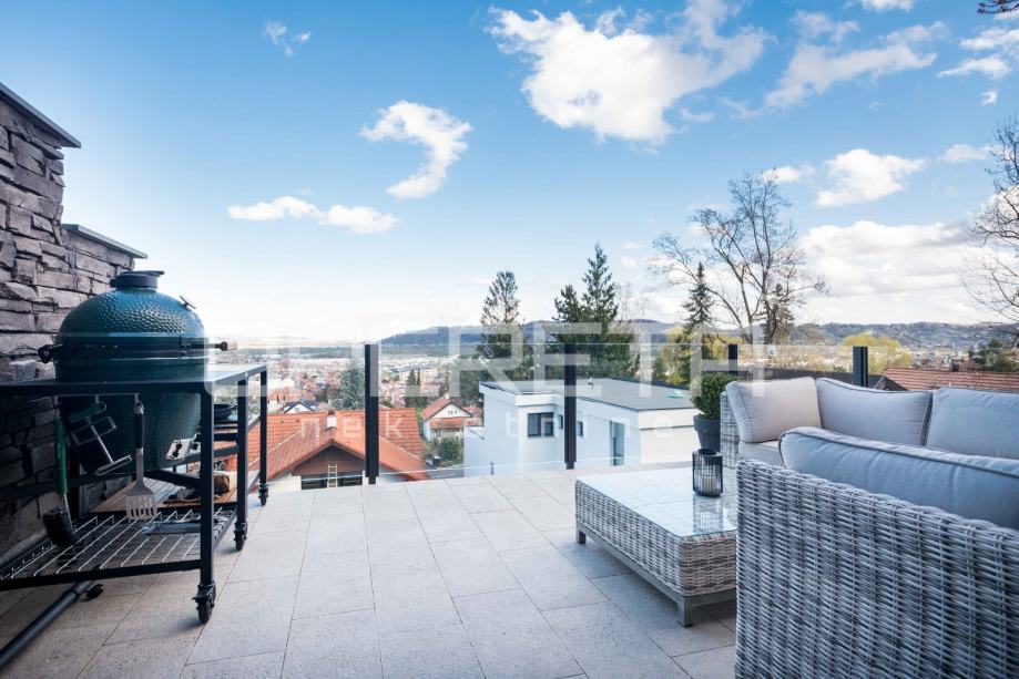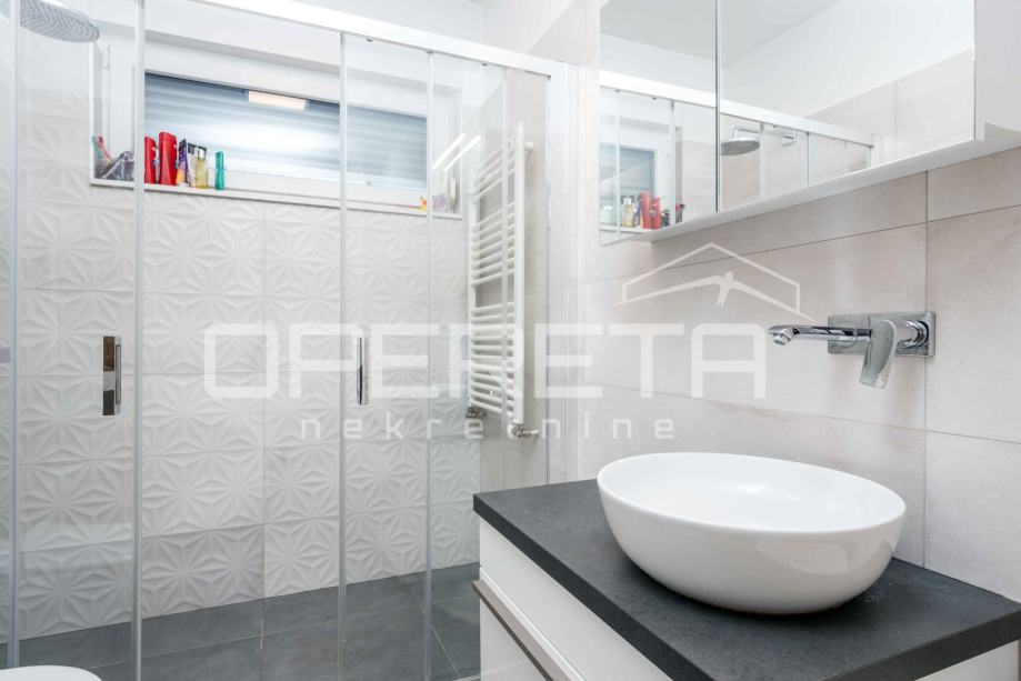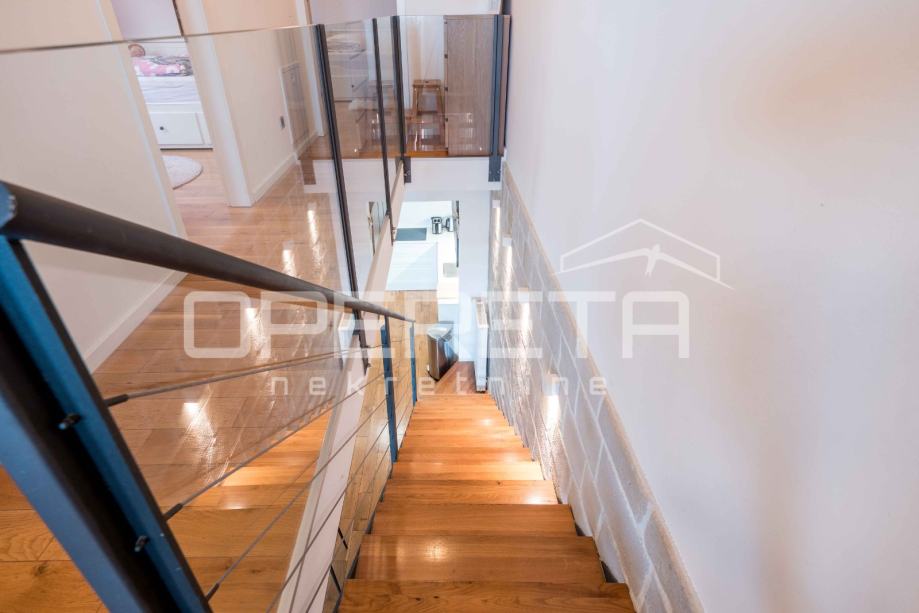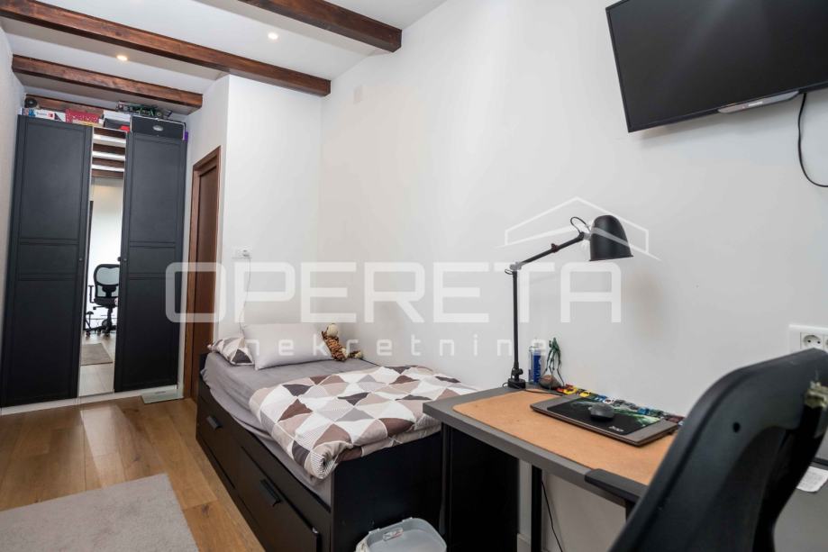 U podrumskoj etaži, koja može funkcionirati zasebno kao cjelina, smješten je dnevni boravak sa izlazom na vrt od 130 m2, spavaća soba, kuhinja, vešeraj, spremište i izba. U prizemnoj etaži se nalazi lijepi dnevni boravak sa blagovaonicom koji ima izlaz na terasu sa koje se pruža lijepi pogled prema Zagrebu i okolici, kuhinjom, kupaonom i ulaznim prostorom. Na katu su smještene 3 komotne spavaće sobe i kupaonica. Posjeduje vanjsko parkirno mjesto i garažno parkirno mjesto. Idealan za obitelj i one koje traže mir nadomak svih potrebnih sadržaja za život.