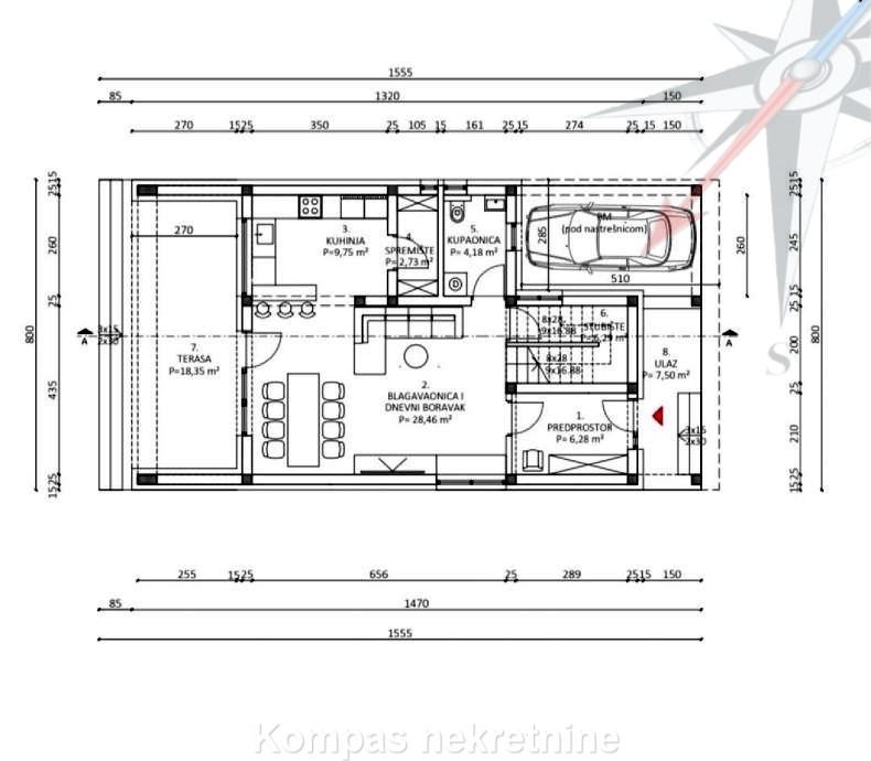 PRIZEMLJE: ulazni trijem, ulazni hodnik, hodnik, vešeraj, spremište, kupaonica sa tušem, dnevni boravak sa blagovaonom, kuhinjom i terasa.