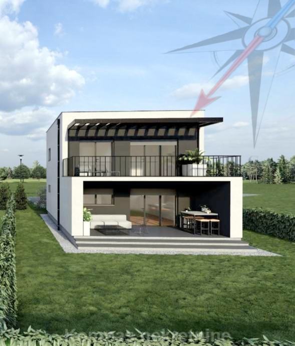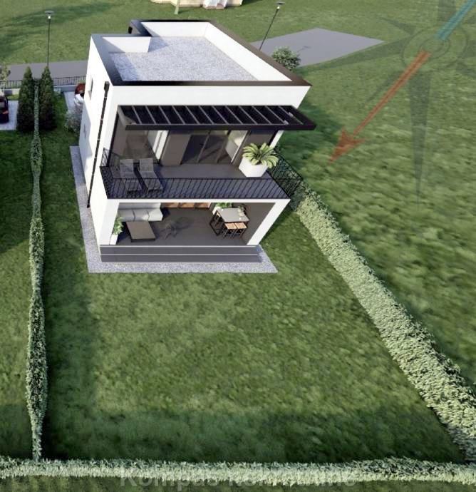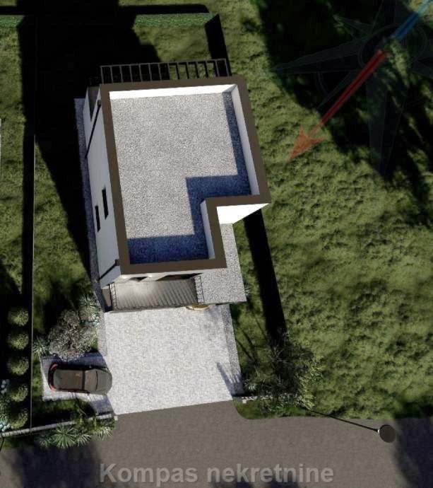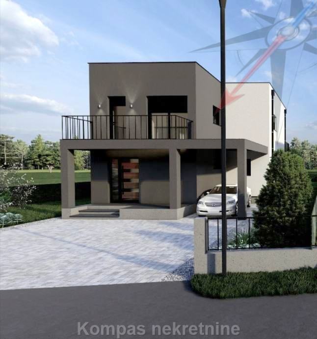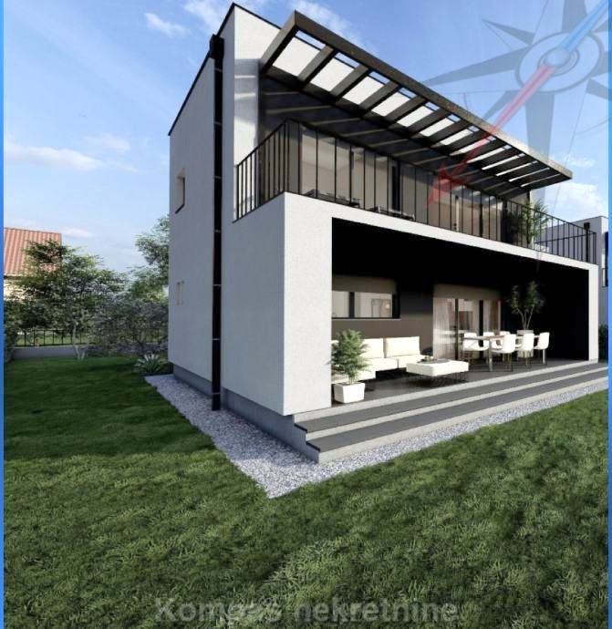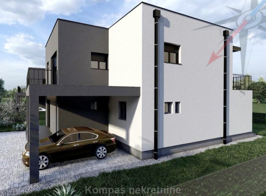Moderna luksuzna kuća na dvije etaže, korisne netto površine 123 m2, s dvorištem od 313 m2 ( zemljište ukupne površine 467 m2 ) i dva parkirna mjesta ( jedno natkriveno ) od ukupno 25 m2. Imat će protuprovalna vrata s elektronskom bravom, protuprovalni sustav zaštite, daljinsko upravljanje grijanjem, hlađenjem, roletama i rasvjetom.