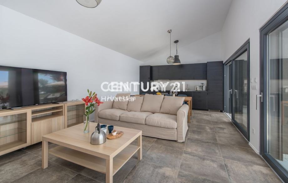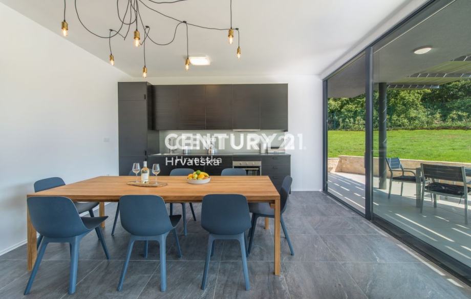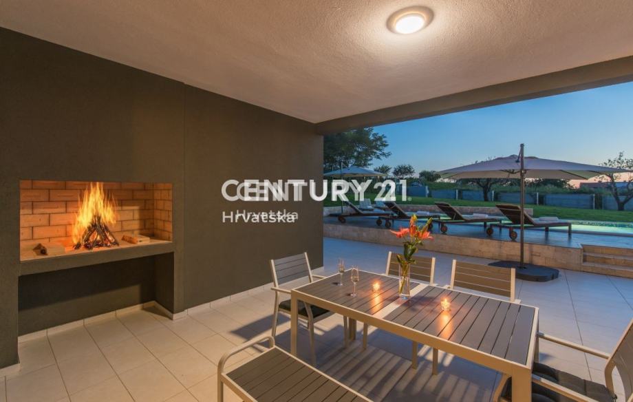 U uređenoj okućnici nalazi se natkrivena terasa s kaminom i spremištem, bazen sa sunčalištem te parking.
