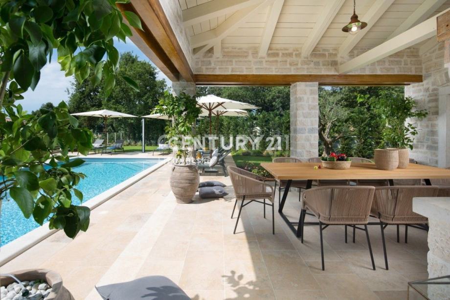 U mirnom naselju između Pazina i Rovinja nalazi se ova luksuzna i dizajnerski namještena vila s uređenom okućnicom i bazenom (12m x 5m) s hidromasažnim kutom.