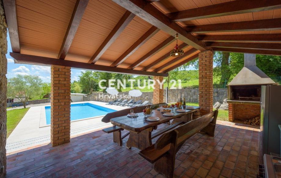 U dvorištu kuće nalazi se bazen površine 57 m2, a uz bazen smješten je pomoćni objekt povrišne 61 m2 na kojem se nalazi vanjska kuhinja i veliki stol s kaminom za roštiljanje na vanjskom dijelu i s unutarnjim kaminom i blagovaoniskim stolom u zatvorenom dijelu objekta.