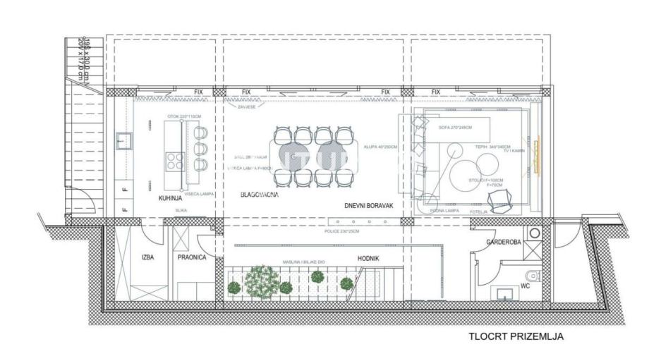 PRIZEMLJE: kuhinja s blagovaonicom i dnevnim boravkom, toalet, tehnička prostorija i vešeraj.