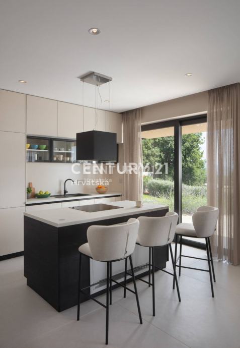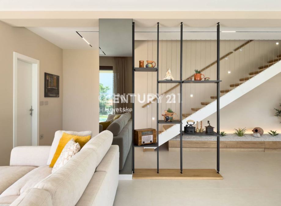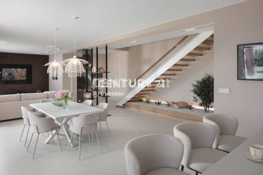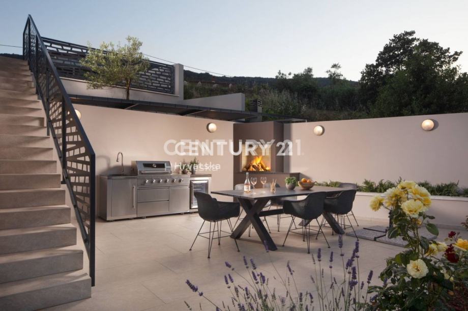 Dnevni prostor povezan je sa vanjskim dijelom velikim staklenim stijenama koje brišu granicu između interijera i eksterijera osiguravajući prekrasan pogled na morsko plavetnilo. Prostrana okućnica prostire se na 657 m2. Potpuno je ograđena i uređena sa velikom pažnjom.