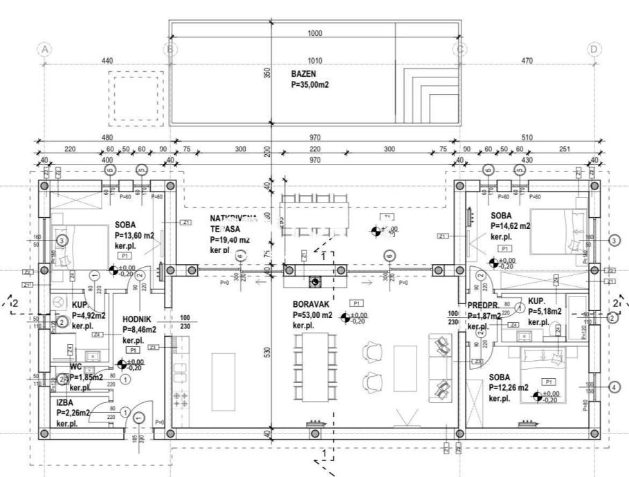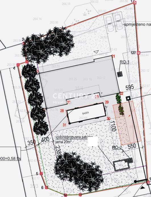Iz dnevnog boravka se kroz velike staklene stijene izlazi na natkrivenu terasu i sunčalište koje okružuje bazen veličine 40 m2.