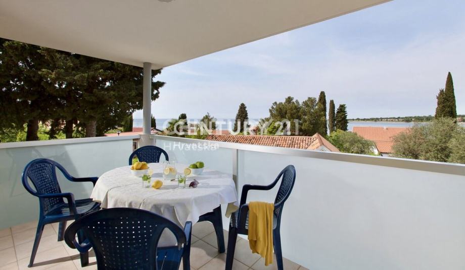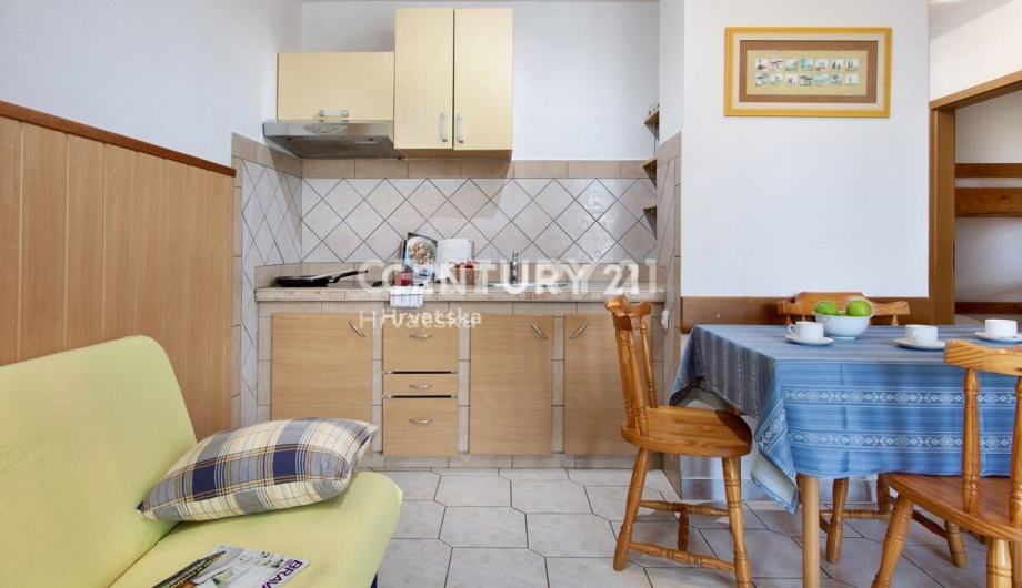 Vanjskim stepeništem penjemo se na prvi kat na kojem se nalazi stan koji se sastoji od ulaznog hodnika, kuhinje sa blagavaonom i dnevnim boravkom otvorenog tipa, dvije spavaće sobe, kupaonice i terase sa koje se pruža pogled na more.