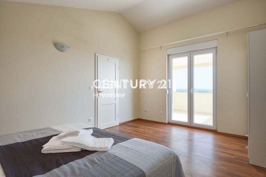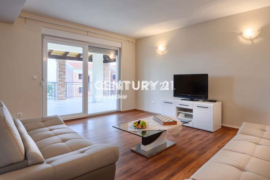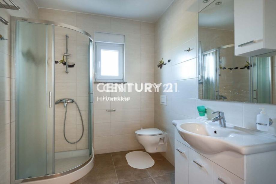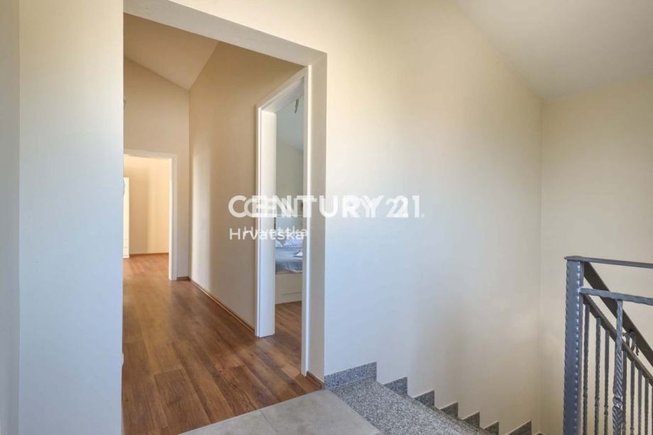 Kuća se prostire na dva kata. U prizemlju su smješteni dnevni boravak s izlazom na natkrivenu terasu, kuhinja, blagovaonica te wc, dok se na katu nalaze 3 spavaće sobe i jedna kupaonica. Jedna od spavaćih soba ima izlaz na terasu s lijepim pogledom na more i okolicu.