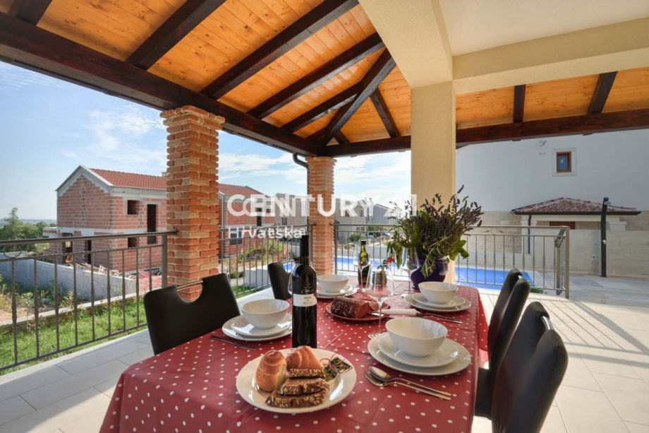 Villa je izgrađena na parceli od 440m2, na kojoj se nalazi i 2 parking mjesta, kao i bazen veličine 20m2. Pokraj bazena nalazi se i natkrivena terasa s malim kaminom za roštilj, tuš i sunčalište.