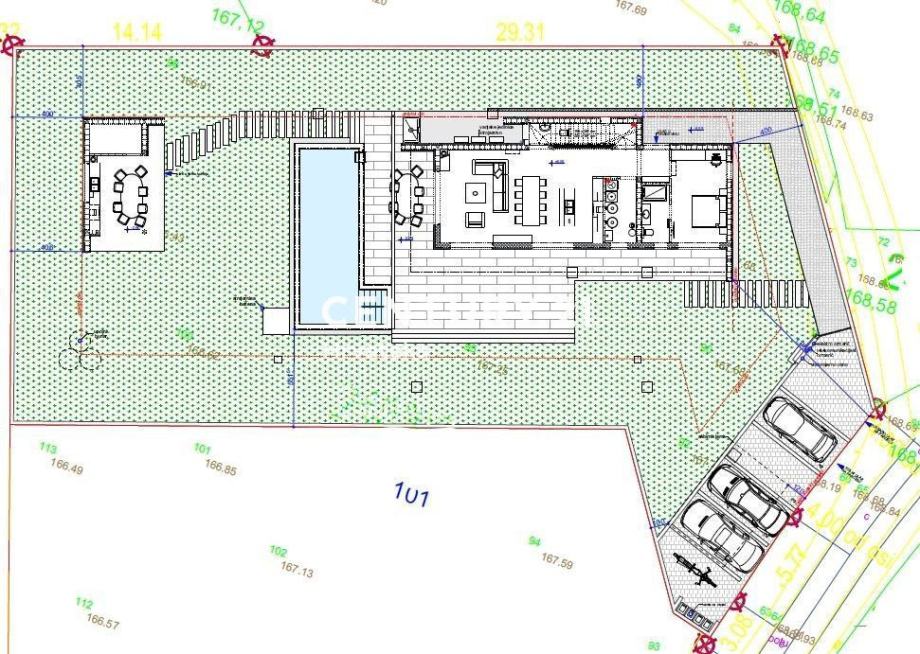 Na zemljištu površine 914m2 nalaziti će se još i bazen površine 30,84m2, te ljetna kuhinja površine 9,86m2.
