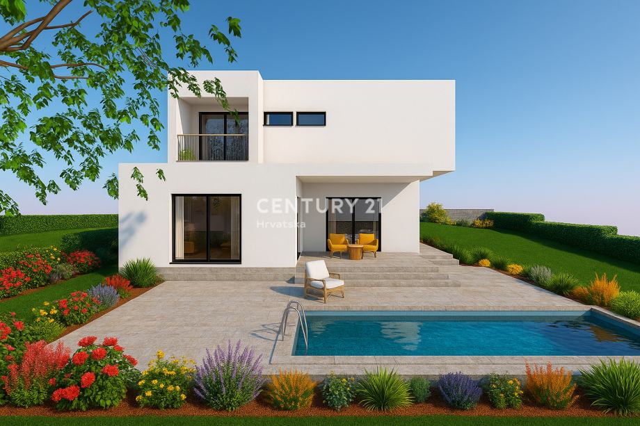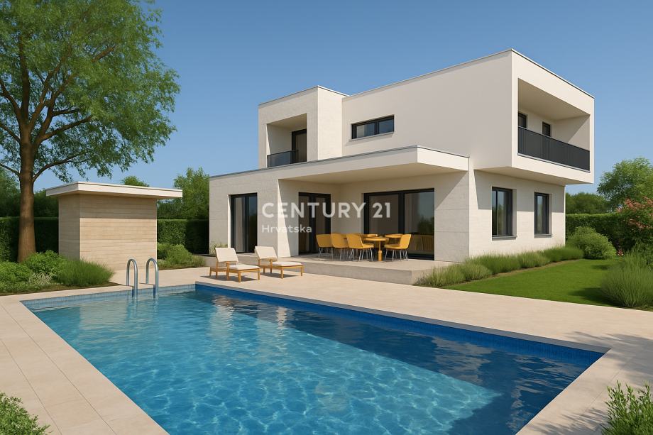 Ova prekrasna villa modernog dizajna nalazi se u mirnom naselju, na rubu građevinske zone, udaljenom 10 minuta vožnje od Poreča i mora.