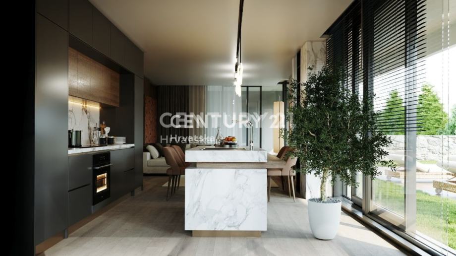 U prizemlju se nalazi ultra moderan dnevni boravak s puno stakla, koji omogućava puno prirodnog svjetla, blagovaonica s moderno opremljenom kuhinjom te spavaća soba.