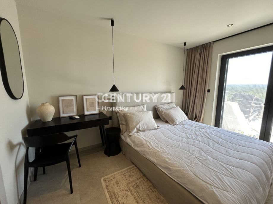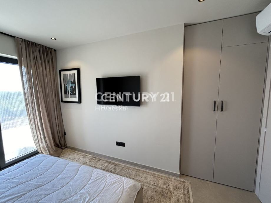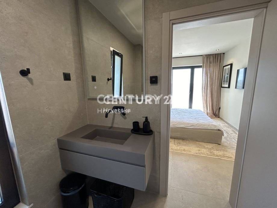 Na katu su tri spavaće sobe od kojih jedna ima vlastitu kupaonu i nenatkrivenu terasu od 13,54 m2 sa kojeg se pruža panoramski pogled na more, dok druge dvije sobe dijele zajedničku kupaonu.