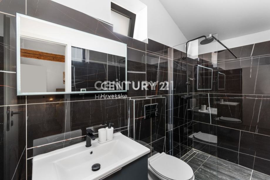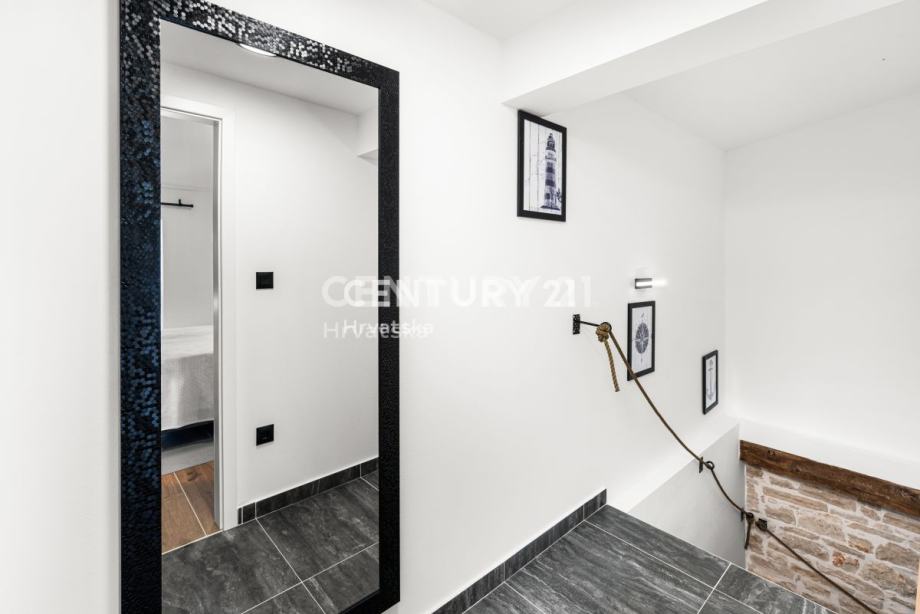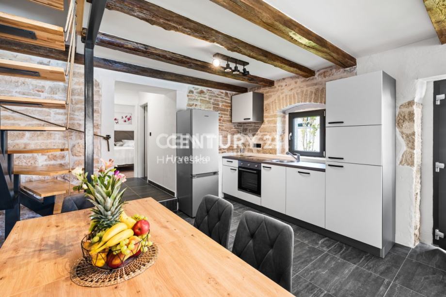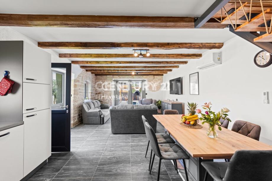 Unutrašnjost kuće oduševljava spojem tradicije i modernosti. Renovirane izvorne drvene grede koje krase strop nekretnine čine prostor toplim i šarmantnim, istovremeno pružajući osjećaj udobnosti.