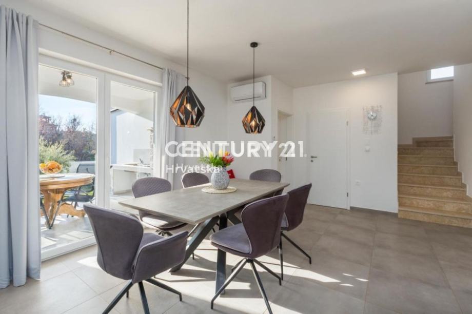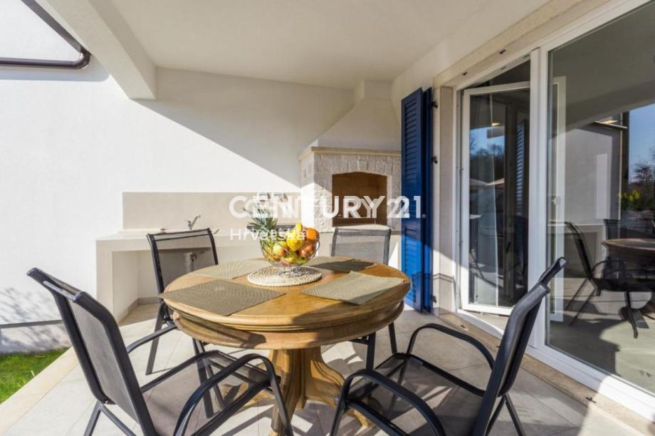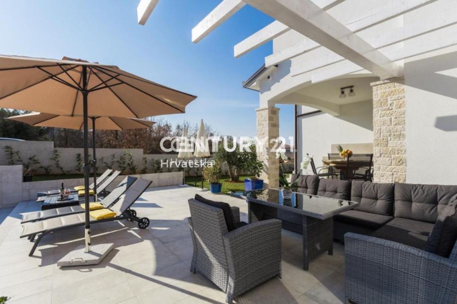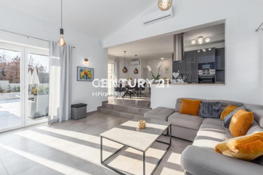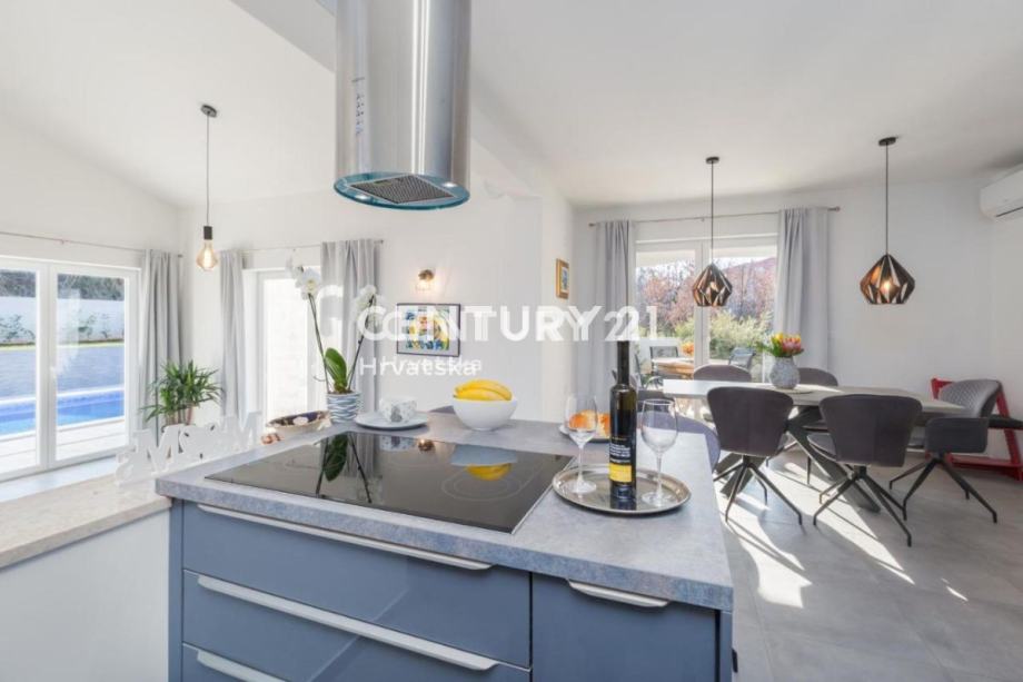 Iz dnevnog prostora izlazi se na natkrivenu terasu i u dvorište s bazenom.