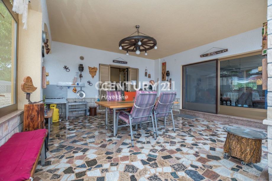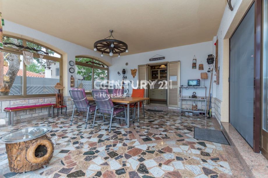 Ulazeći u interijer, hodnik vodi u prostrani dnevni boravak i blagovaonicu, diskretno izdvojenu kuhinju sa izlazom na vanjsku natkrivenu terasu, te otvoreni prostor druge vanjske terase ispred ulaza u kuću.