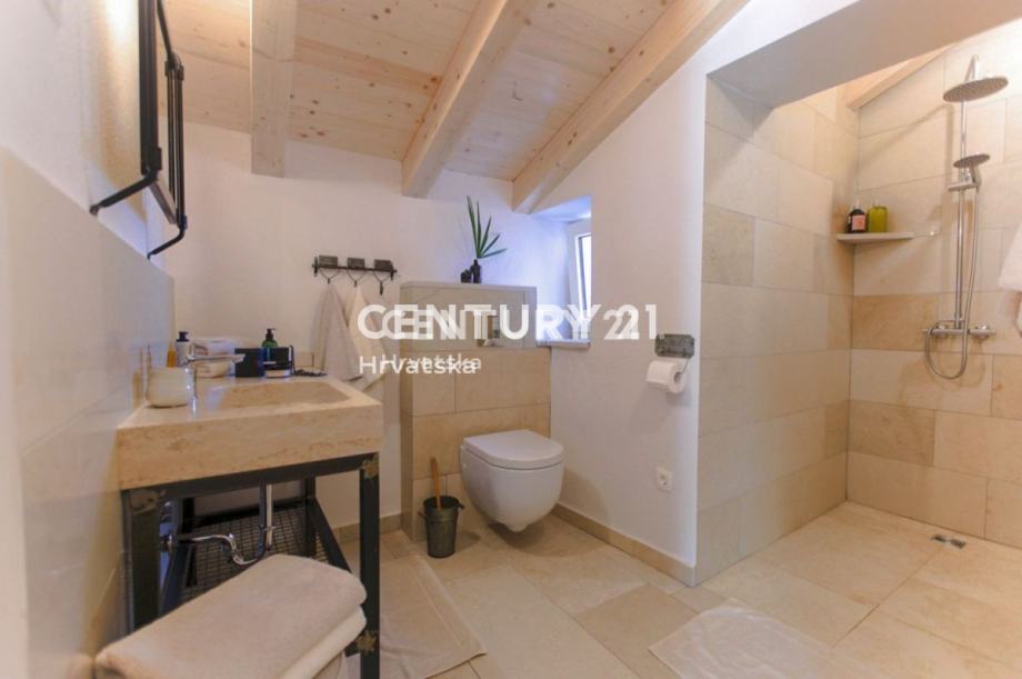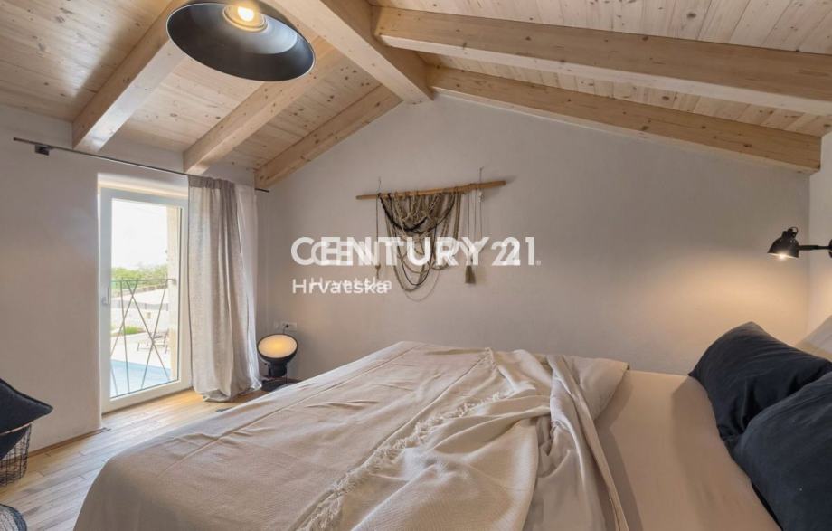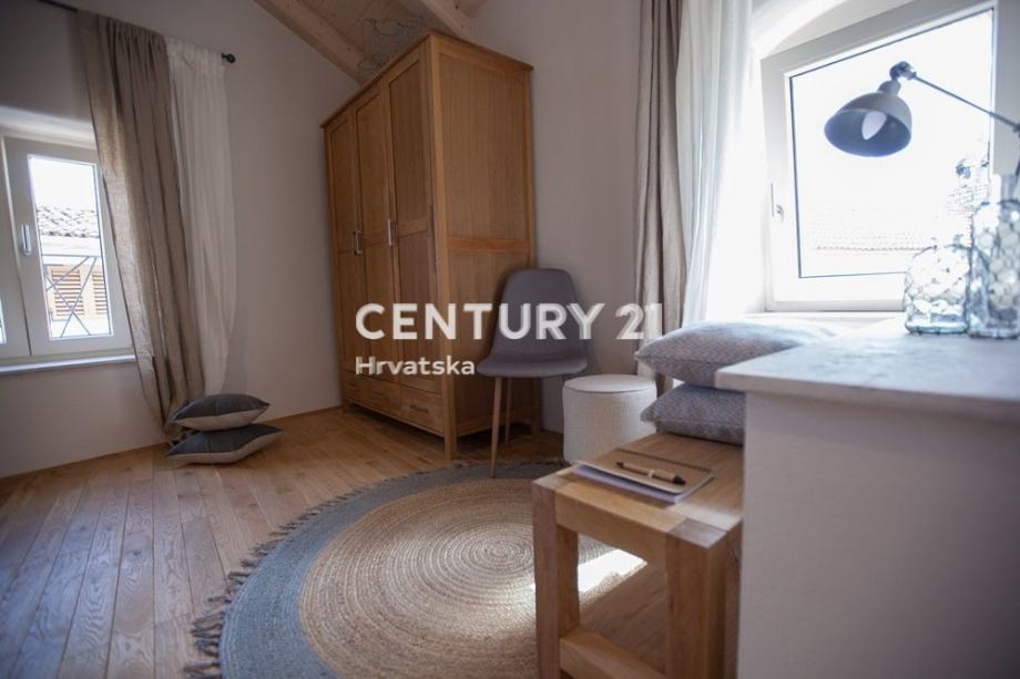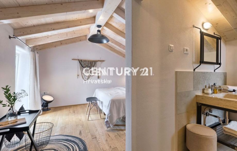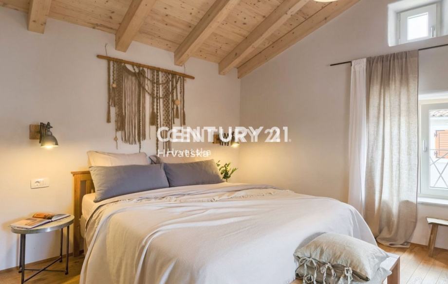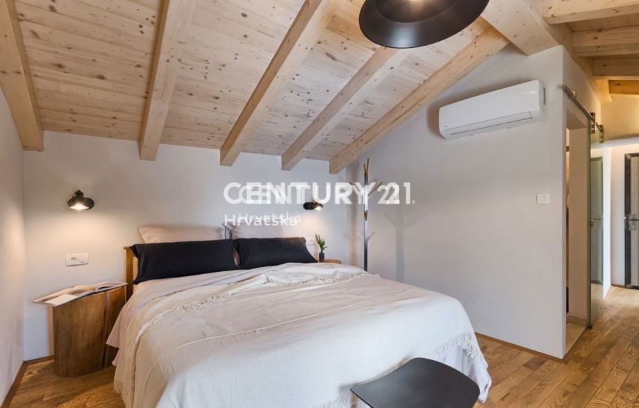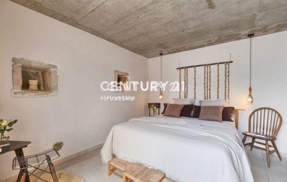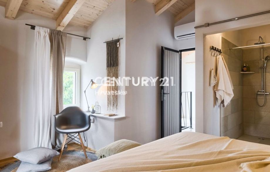 Interijer je posebno atraktivna priča kojoj se možete diviti beskrajno. Čine ga tri spavaće sobe u en suite varijanti, pri čemu svaka kupaonica ima podno grijanje. Dnevni boravak je prostran i udoban, baš kao i kuhinja koja vas naprosto poziva da u ovom fantastičnom okruženju pokažete svoja kulinarska umijeća. Unutrašnjost je koncipirana na način da se u prizemnom dijelu nalaze jedna spavaća soba s kupaonicom, kuhinja, dnevni boravak i blagovaonica, dok su na katu druge dvije spavaće sobe, svaka sa svojom terasom za najljepša jutra ili najugodnije večeri. Sve prostorije u vili su klimatizirane. A s obzirom da je današnja vila nastala iz stotinu godina stare, tradicionalne kuće, uz autohtone, originalne detalje u interijeru ciljano prevladavaju neutralne nijanse stopljene s prirodnim materijalima poput drveta i kamena. Unutrašnjost odiše prozračnim luksuzom upotpunjenim detaljima poput birane keramike, zidnih makramea ili unikatne, dizajnerske rasvjete. Drvene grede u spavaćim sobama i kupaonicama daju taj posebni rustikalni šarm, koji je dodatno obogaćen prirodnim tkaninama što prevladavaju u tekstilnom dekoru.Sve ovo može biti vaše uz maksimalnu privatnost, zidove koji omeđuju parcelu i pružaju potpunu sigurnost. Također ima i zatvorenu, zaštićenu ostavu te dva parkirna mjesta.