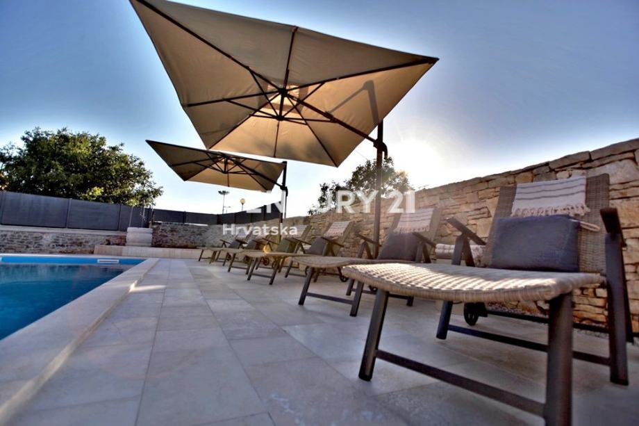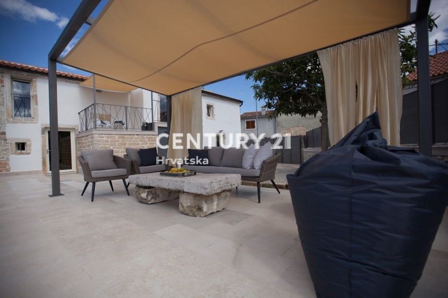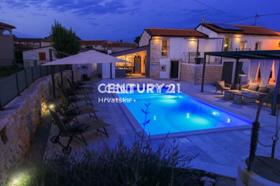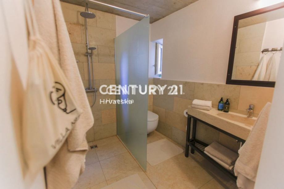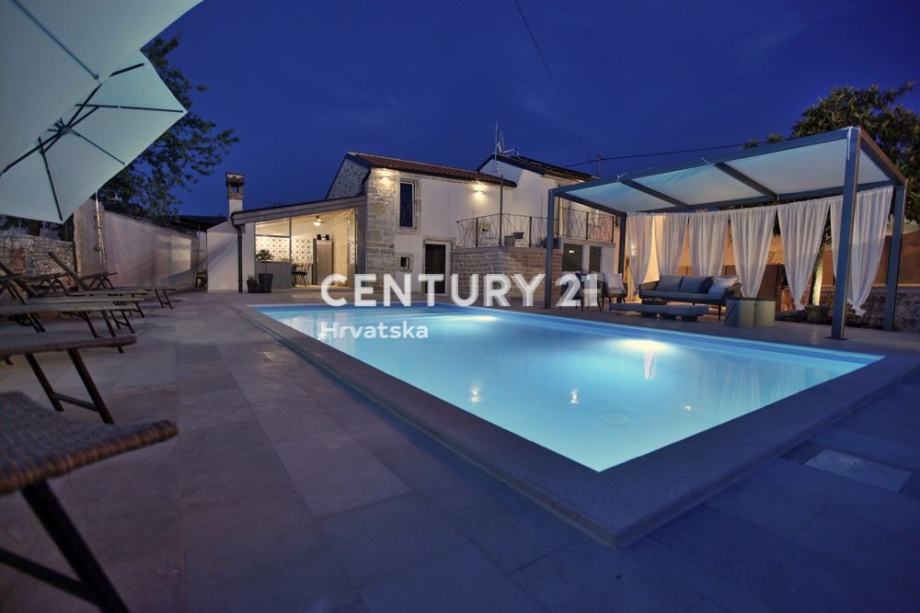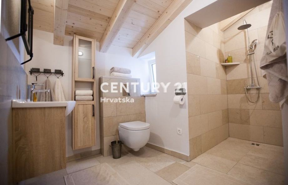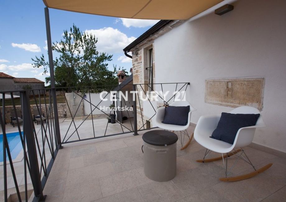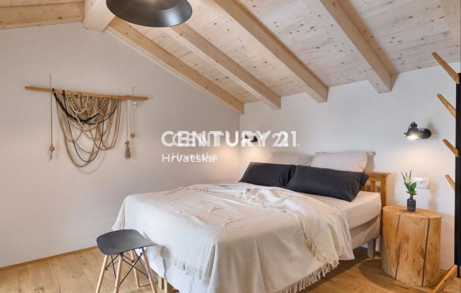 Interijer je posebno atraktivna priča kojoj se možete diviti beskrajno. Čine ga tri spavaće sobe u en suite varijanti, pri čemu svaka kupaonica ima podno grijanje. Dnevni boravak je prostran i udoban, baš kao i kuhinja koja vas naprosto poziva da u ovom fantastičnom okruženju pokažete svoja kulinarska umijeća. Unutrašnjost je koncipirana na način da se u prizemnom dijelu nalaze jedna spavaća soba s kupaonicom, kuhinja, dnevni boravak i blagovaonica, dok su na katu druge dvije spavaće sobe, svaka sa svojom terasom za najljepša jutra ili najugodnije večeri. Sve prostorije u vili su klimatizirane. A s obzirom da je današnja vila nastala iz stotinu godina stare, tradicionalne kuće, uz autohtone, originalne detalje u interijeru ciljano prevladavaju neutralne nijanse stopljene s prirodnim materijalima poput drveta i kamena. Unutrašnjost odiše prozračnim luksuzom upotpunjenim detaljima poput birane keramike, zidnih makramea ili unikatne, dizajnerske rasvjete. Drvene grede u spavaćim sobama i kupaonicama daju taj posebni rustikalni šarm, koji je dodatno obogaćen prirodnim tkaninama što prevladavaju u tekstilnom dekoru.Sve ovo može biti vaše uz maksimalnu privatnost, zidove koji omeđuju parcelu i pružaju potpunu sigurnost. Također ima i zatvorenu, zaštićenu ostavu te dva parkirna mjesta.