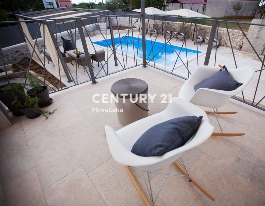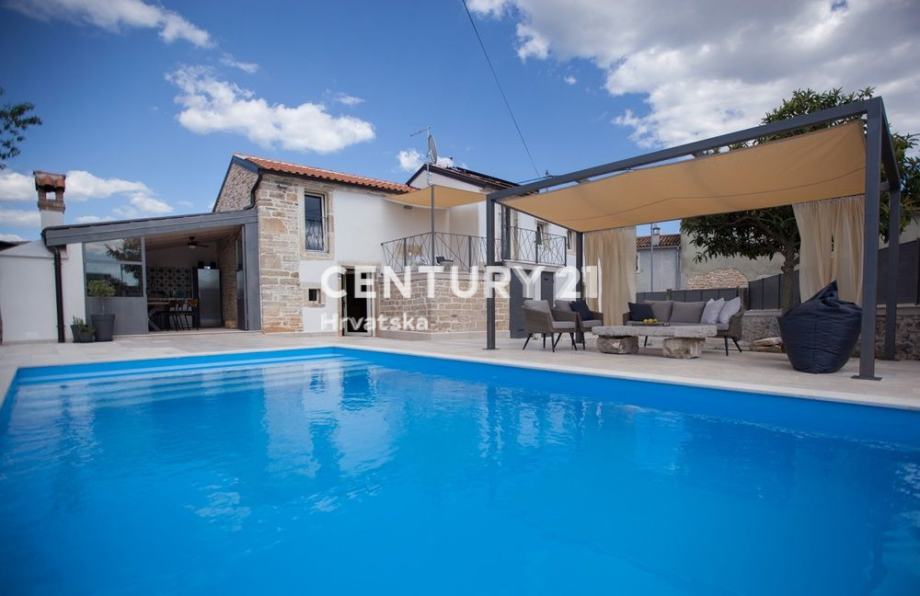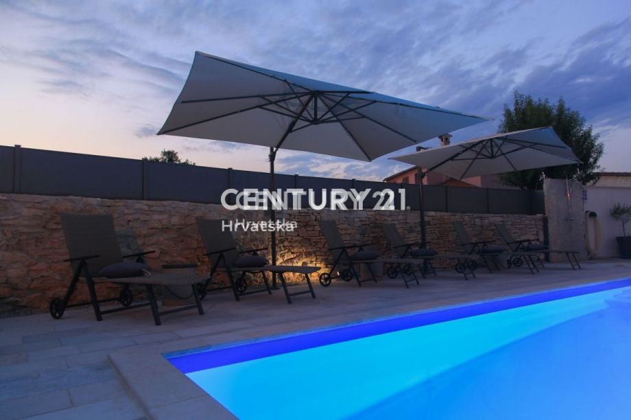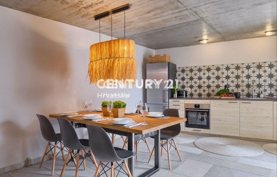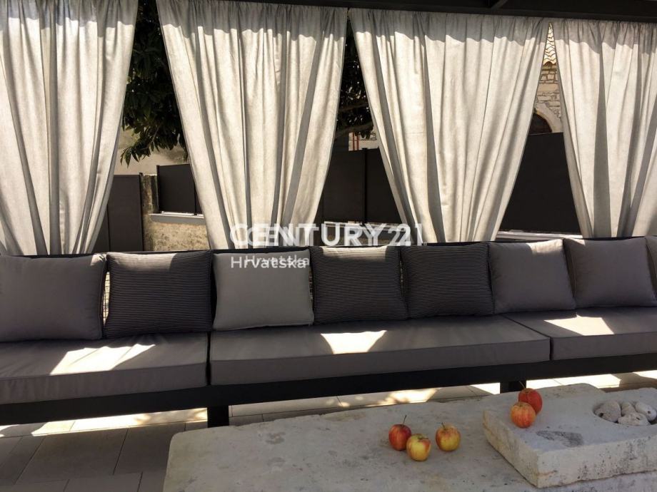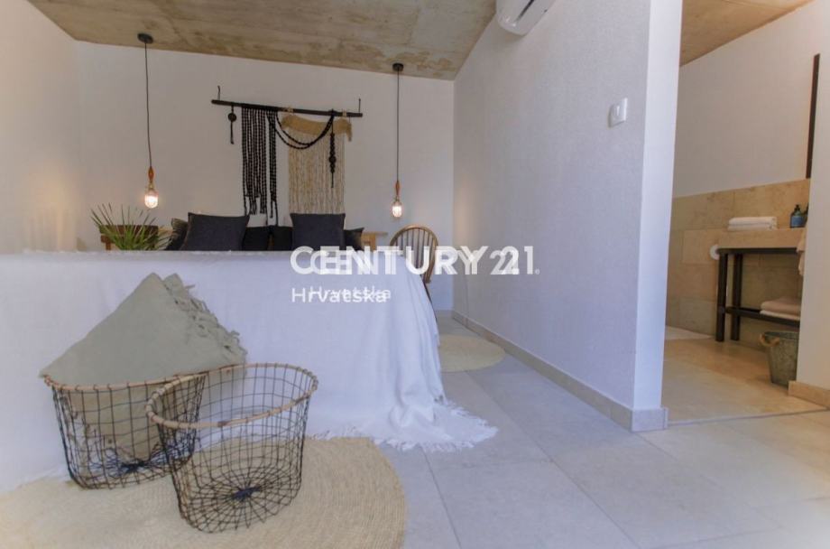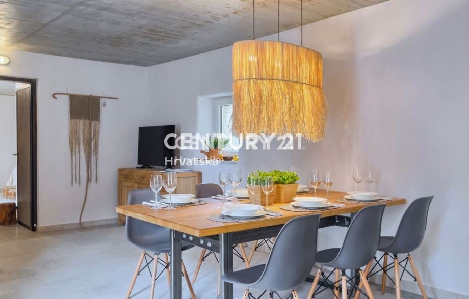 Interijer je posebno atraktivna priča kojoj se možete diviti beskrajno. Čine ga tri spavaće sobe u en suite varijanti, pri čemu svaka kupaonica ima podno grijanje. Dnevni boravak je prostran i udoban, baš kao i kuhinja koja vas naprosto poziva da u ovom fantastičnom okruženju pokažete svoja kulinarska umijeća. Unutrašnjost je koncipirana na način da se u prizemnom dijelu nalaze jedna spavaća soba s kupaonicom, kuhinja, dnevni boravak i blagovaonica, dok su na katu druge dvije spavaće sobe, svaka sa svojom terasom za najljepša jutra ili najugodnije večeri. Sve prostorije u vili su klimatizirane. A s obzirom da je današnja vila nastala iz stotinu godina stare, tradicionalne kuće, uz autohtone, originalne detalje u interijeru ciljano prevladavaju neutralne nijanse stopljene s prirodnim materijalima poput drveta i kamena. Unutrašnjost odiše prozračnim luksuzom upotpunjenim detaljima poput birane keramike, zidnih makramea ili unikatne, dizajnerske rasvjete. Drvene grede u spavaćim sobama i kupaonicama daju taj posebni rustikalni šarm, koji je dodatno obogaćen prirodnim tkaninama što prevladavaju u tekstilnom dekoru.Sve ovo može biti vaše uz maksimalnu privatnost, zidove koji omeđuju parcelu i pružaju potpunu sigurnost. Također ima i zatvorenu, zaštićenu ostavu te dva parkirna mjesta.