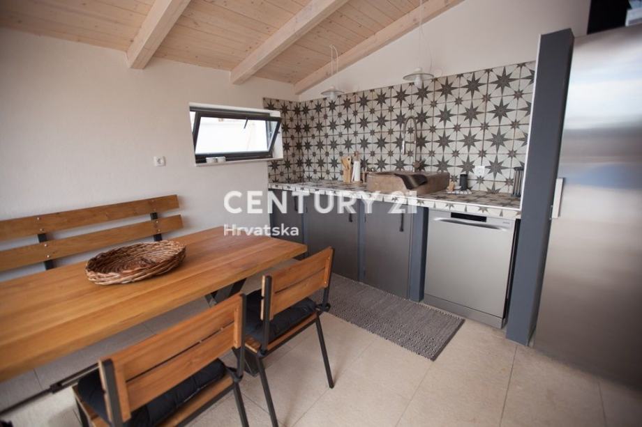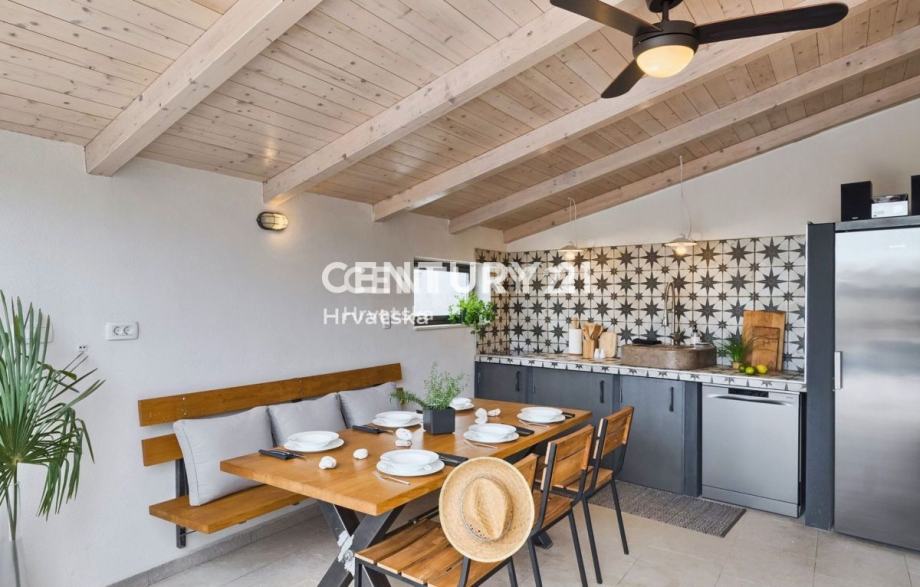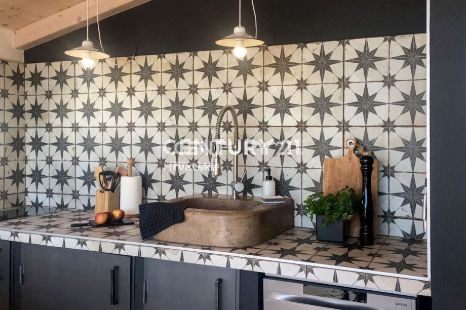 Originalna kuća datira iz 1921. godine, a 2017. je posve renovirana na način koji doista ostavlja bez daha. Na parceli od 450 m2 smještena je glavna kuća površine 100 m2, dok se uz nju nalazi zasebna građevina od 20 m2, uređena kao ljetna kuhinja. Ali ne bilo kakva, već vrhunski opremljena svim uređajima, i direktno povezana s grijanim bazenom od 32 m2 kojem toplinu vode osiguravaju solarni paneli, baš kao i u ostatku kuće, što daje dodatnu, energetski učinkovitu komponentu te čini ovu kuću eco friendly zdanjem. Ostanimo još malo u vanjskom prostoru, koji je tako dobro osmišljen za relaksaciju, da u najljepšim danima godine u ovoj nekretnini praktički možete živjeti vani. Jer uz već spomenutu ljetnu kuhinju, bazen i lounge zonu, tu je i roštilj, tuš neposredno uz bazen, ali i vanjska kupaonica koja pruža maksimalnu udobnost tokom boravka uz bazen. Sve ovo nabrojano izgrađeno je i opremljeno materijalima prve klase.