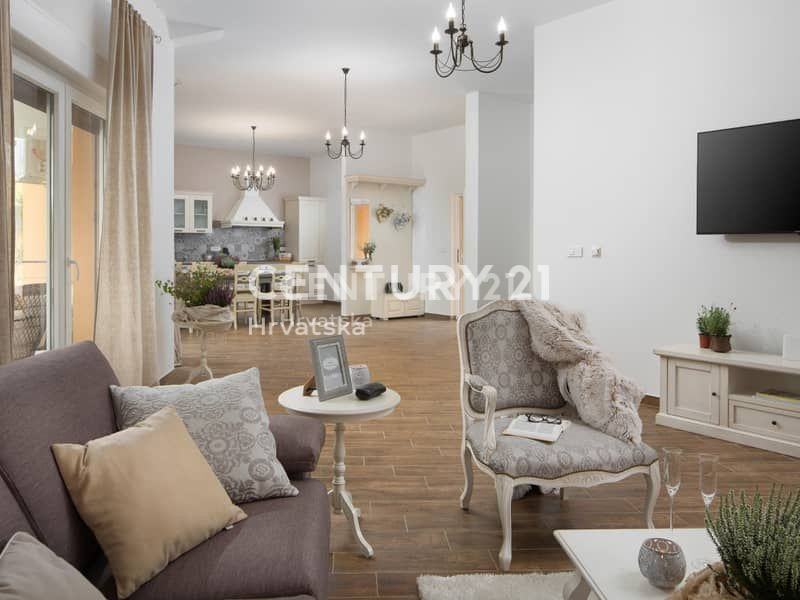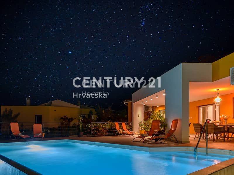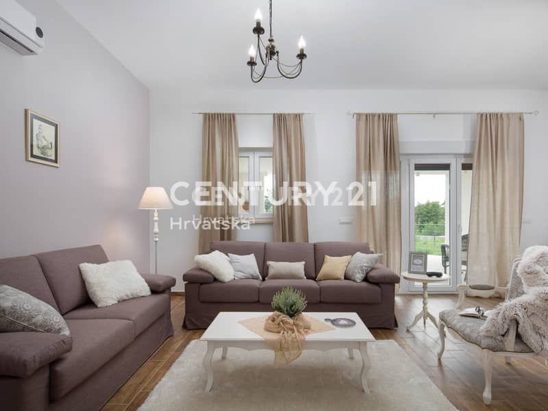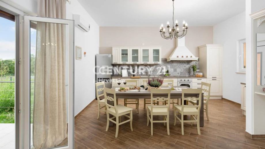 Sastoji se od prostranog ulaza, velikog, otvorenog tlocrta dnevnog boravka s potpuno opremljenom kuhinjom, izlazom na veliku terasu i bazen,3 spavaće sobe i 3 kupaonice i ostave. Otvorenog rasporeda s velikim francuskim vratima koja propuštaju puno svjetla tijekom dana, pa kuća ostavlja vrlo prostran i svijetao dojam.