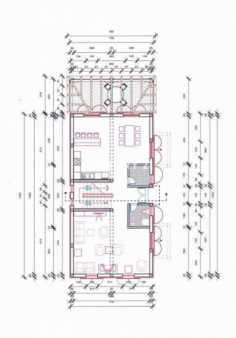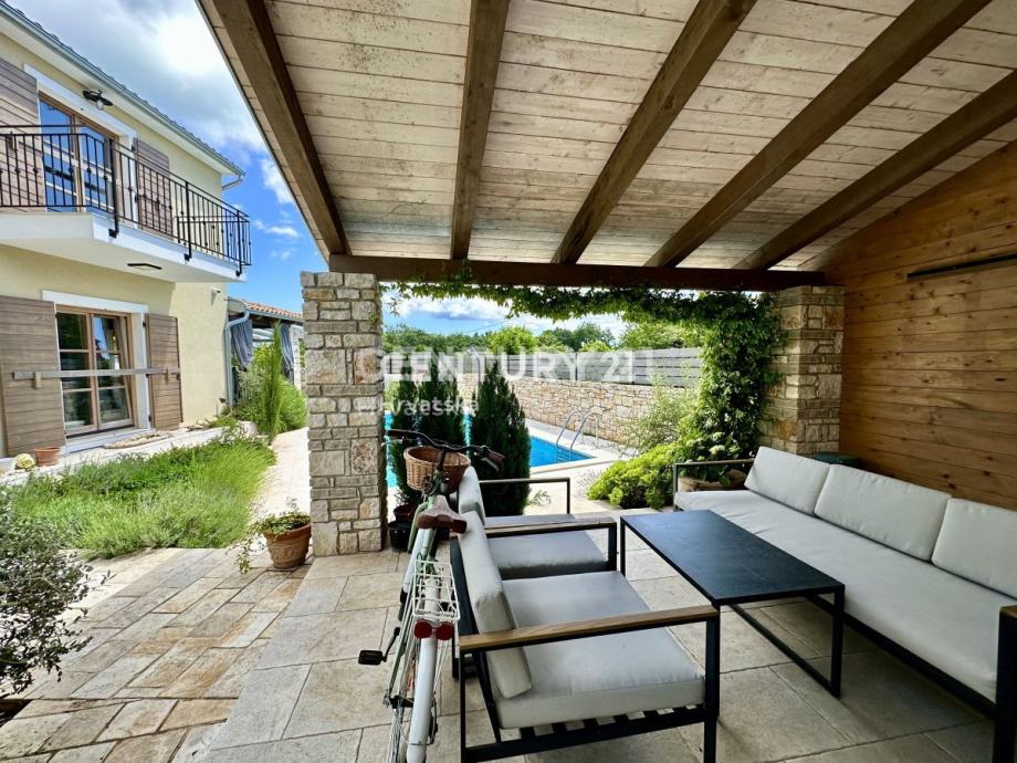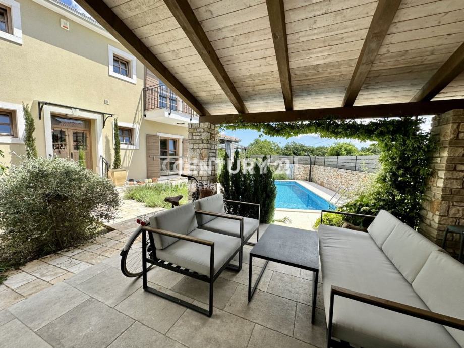 Stambena površina kuće iznosi 235 m2 i sastoji se od dnevnih prostorija u prizemlju s izlazom na prekrasnu terasu, vanjsku kuhinju i bazen. Na katu se nalaze 4 spavaće sobe s vlastitim kupaonicama i vešeraj.