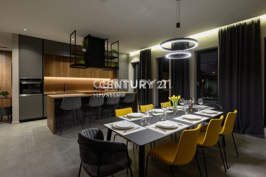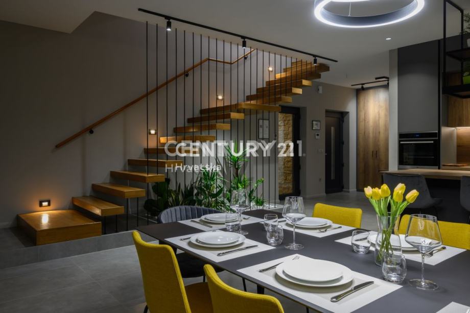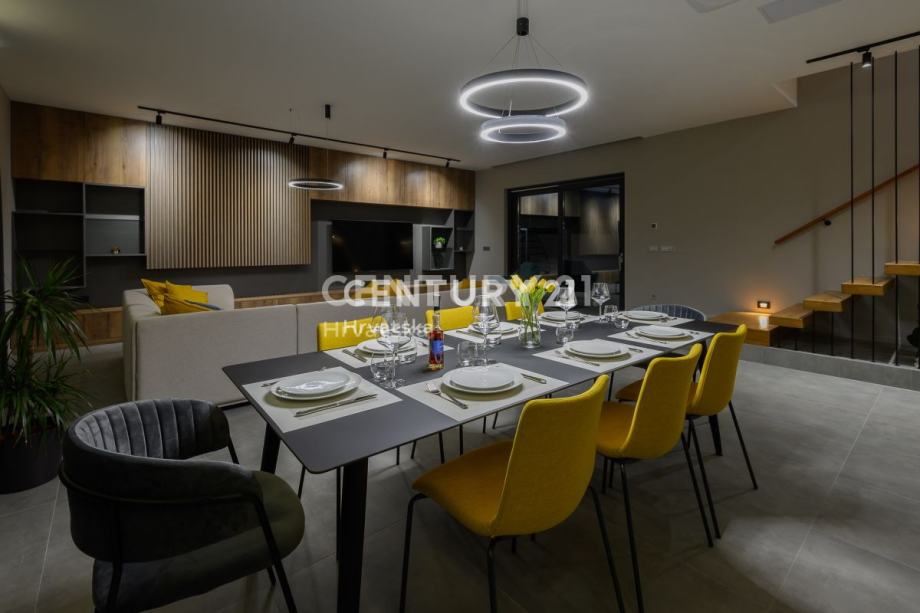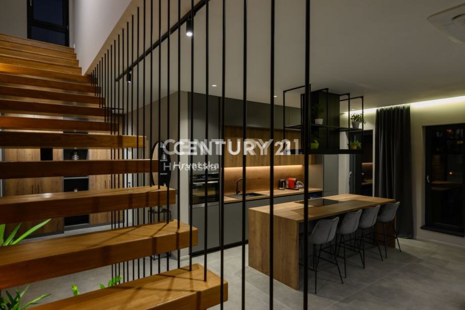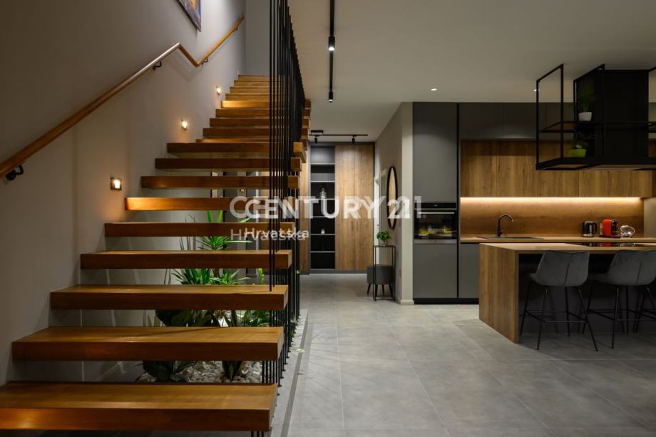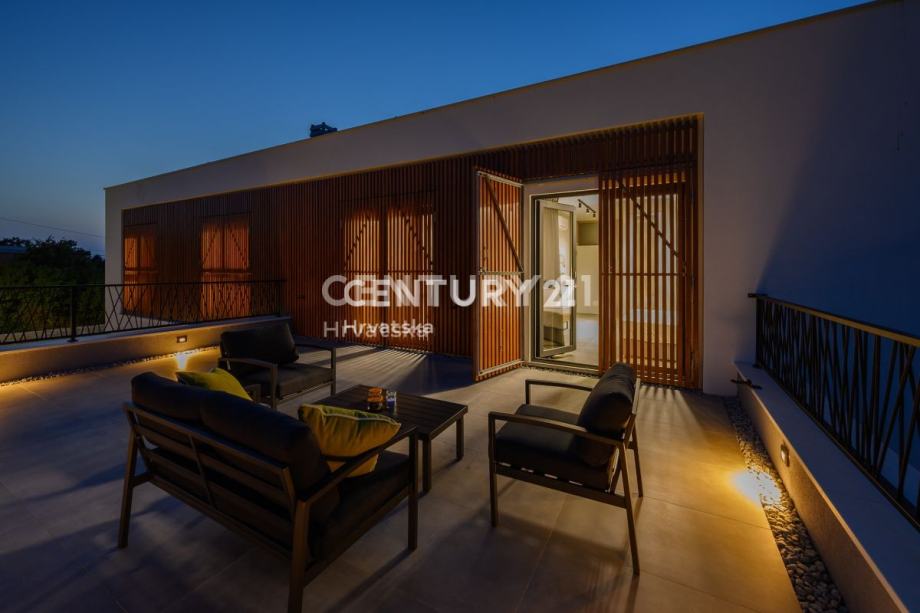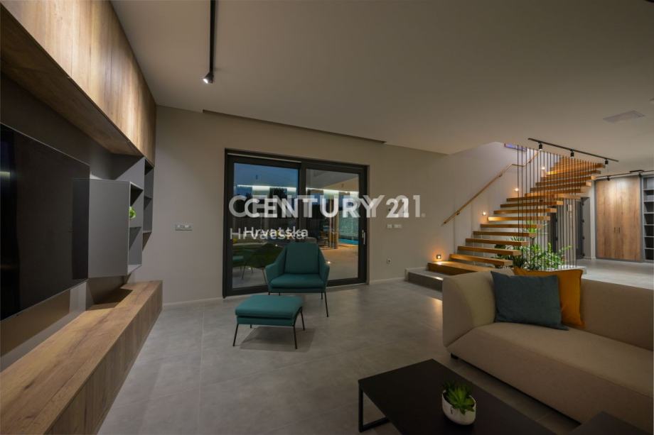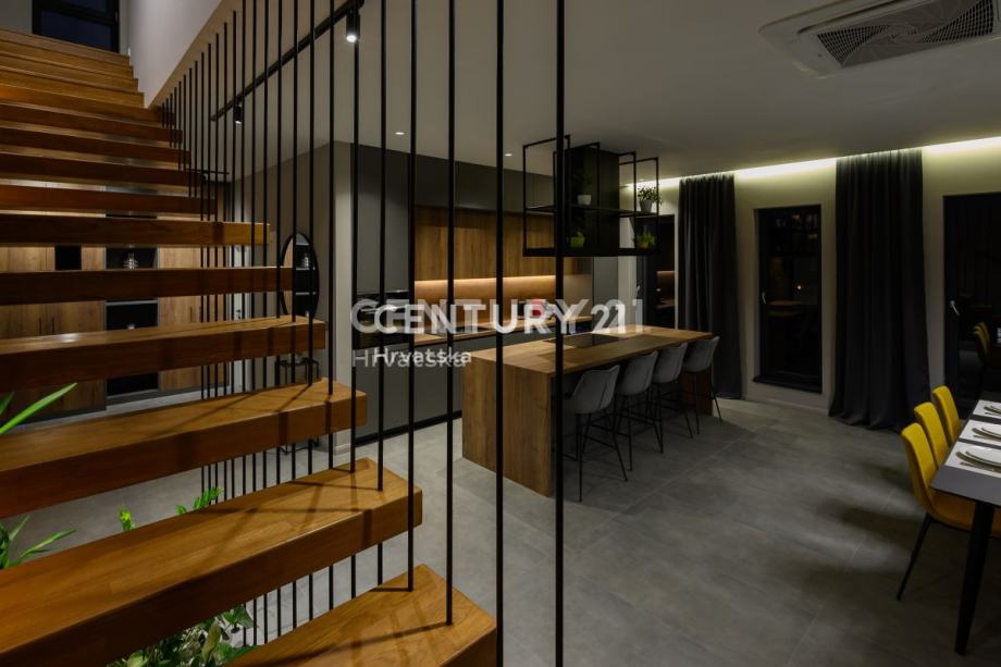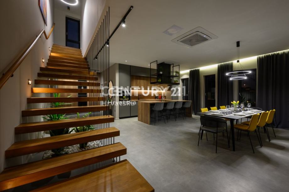 Prizemlje obuhvaća prostrani dnevni boravak s izlazom na terasu i uređenu okućnicu, elegantnu kuhinju s otokom, toalet i praktičnu praonicu. Na katu se nalaze četiri luksuzne spavaće sobe, svaka s vlastitom kupaonicom, dok dvije sobe imaju izlaz na balkon. Prozori su opremljeni komarnicima, a drvene grilje skladno su uklopljene u dizajn, pridonoseći modernom izgledu kuće.