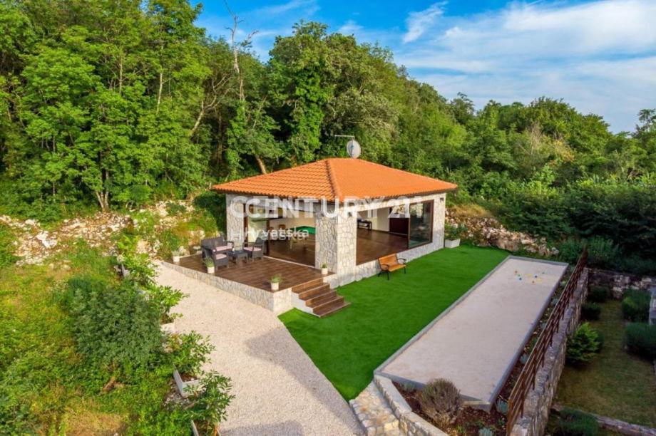 Vila je smještena na prekrasno uređenoj i ograđenoj okućnici od 700 m2 i ima divan pogled na netaknutu prirodu. Vila se svojim dizajnom izvana i iznutra savršeno spaja s okolinom.