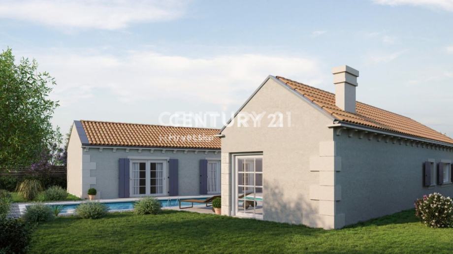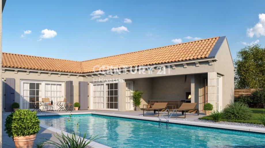 Ova prekrasna prizemnica nalazi se u mirnom naselju udaljenom 20 min vožnje od Poreča i mora, na parceli veličine 920m2.