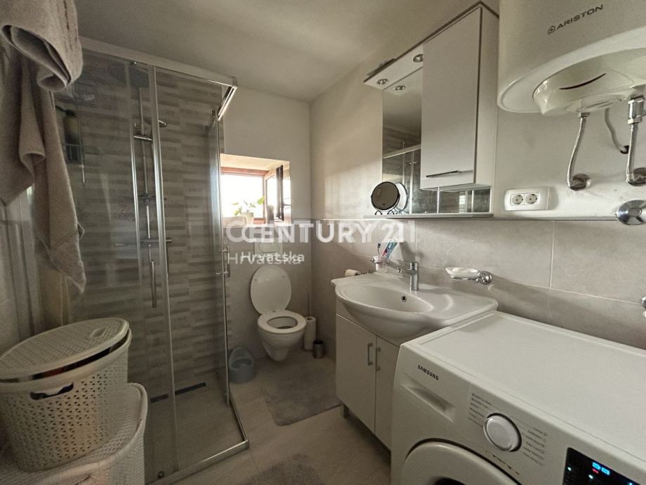 Također u prizemlju ali sa drugim ulazom smješten je ulazni hodnik, kuhinja sa blagavaonom, dnevni boravak sa izlaskom na prostranu terasu sa prekrasnim pogledom na grad i more, spavaća soba i kupaonica.