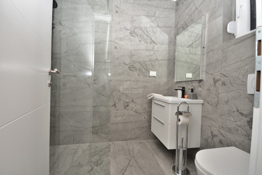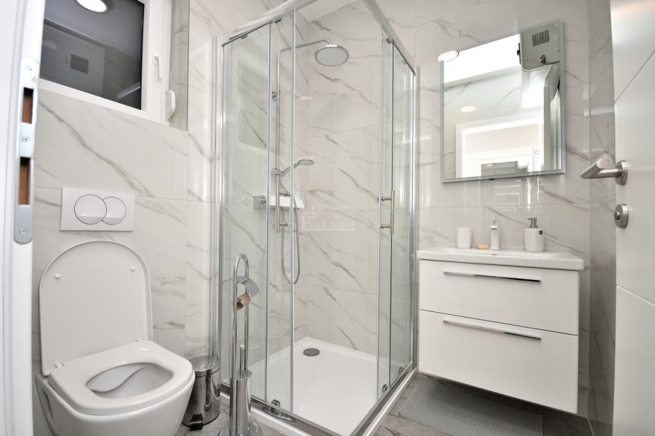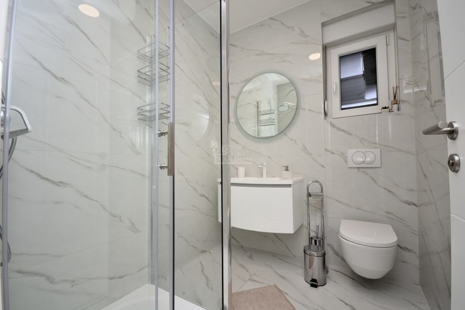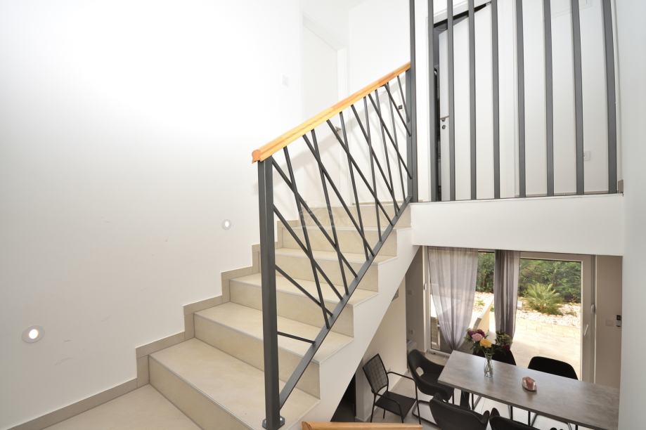 Kuća ima rani krov te postoji mogućnost korištenja istog kao krovne terase od 80 m2 s koje se pruža pogled na okolicu , more i otoke , potrebno je smao instalirati kružne stepenice .
