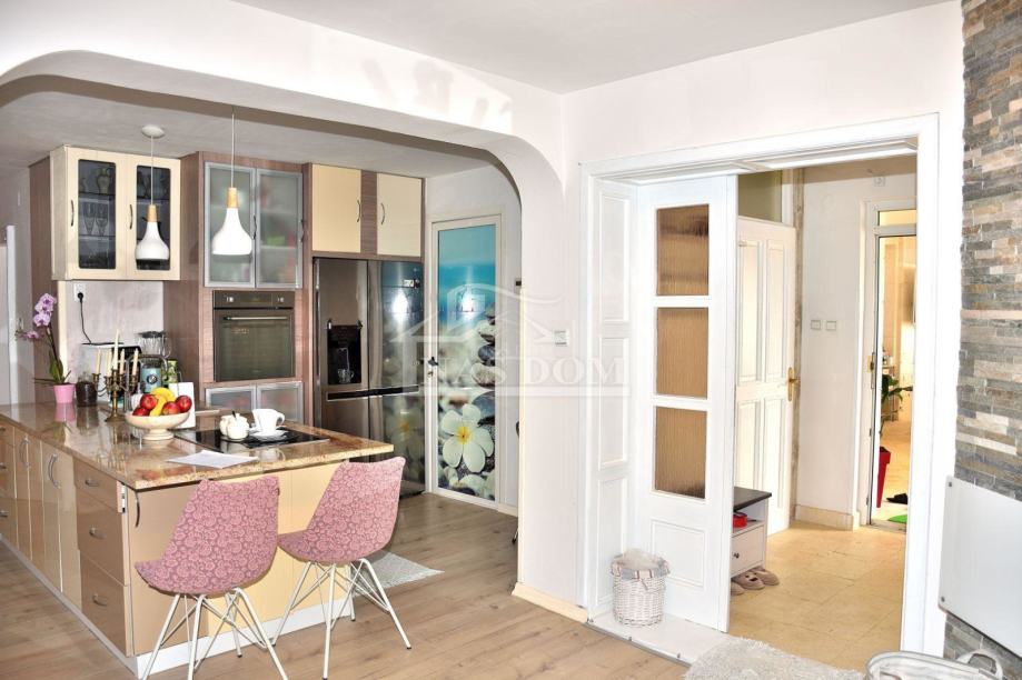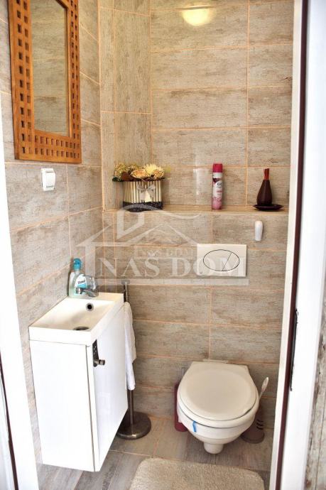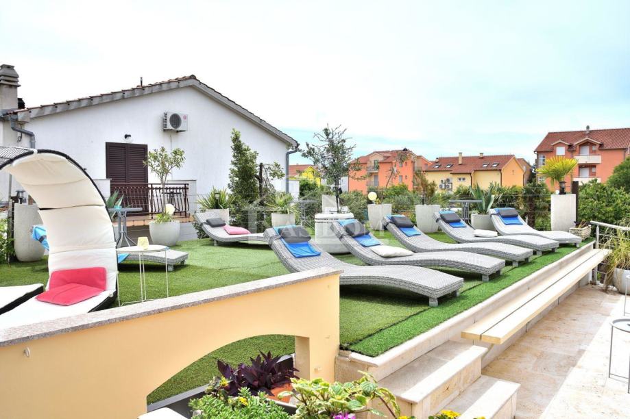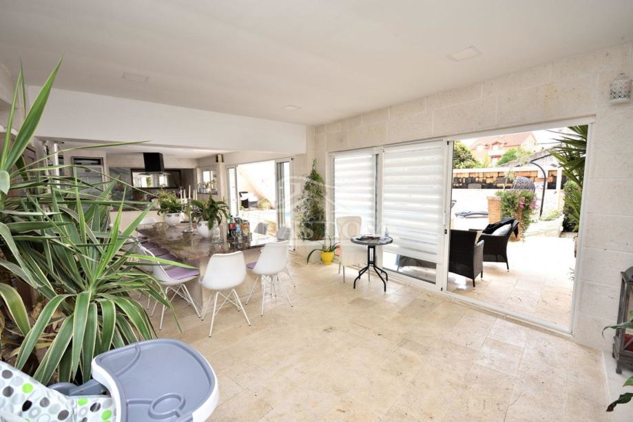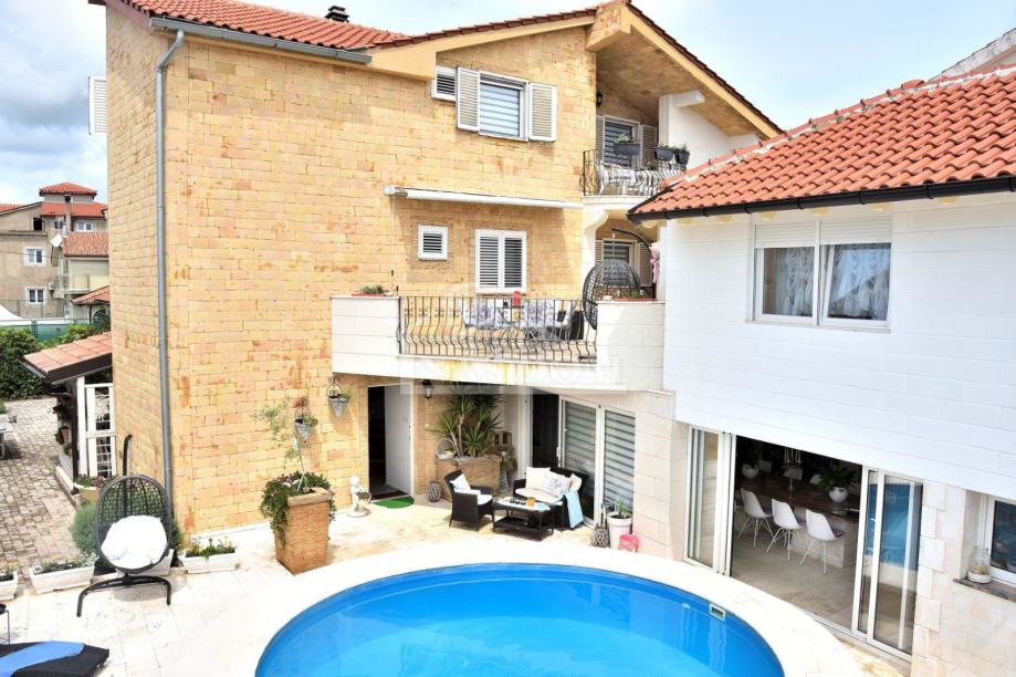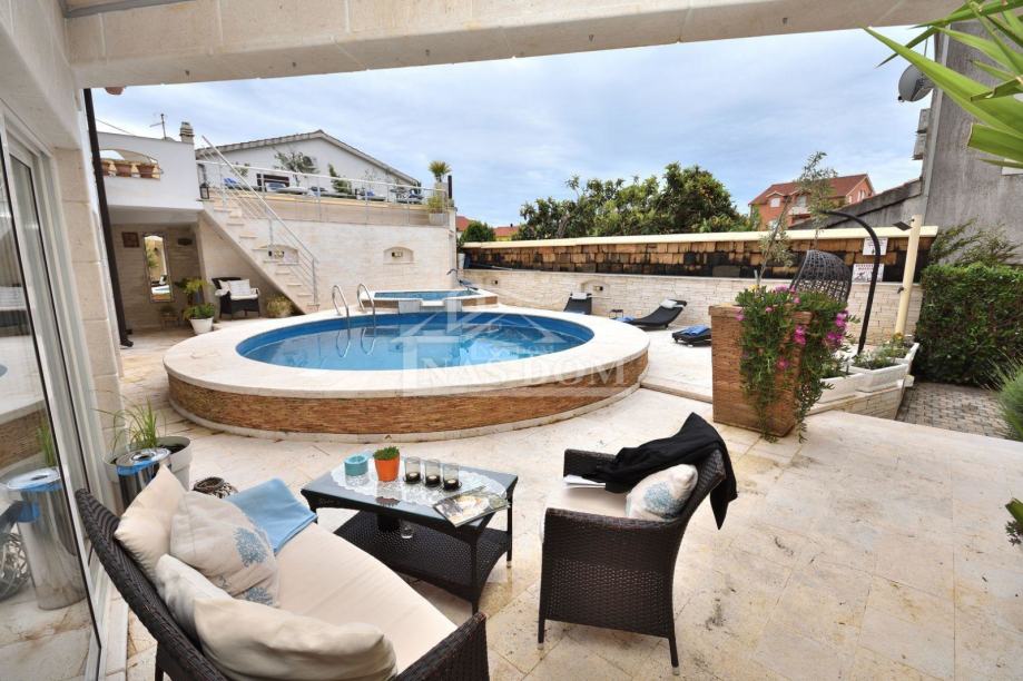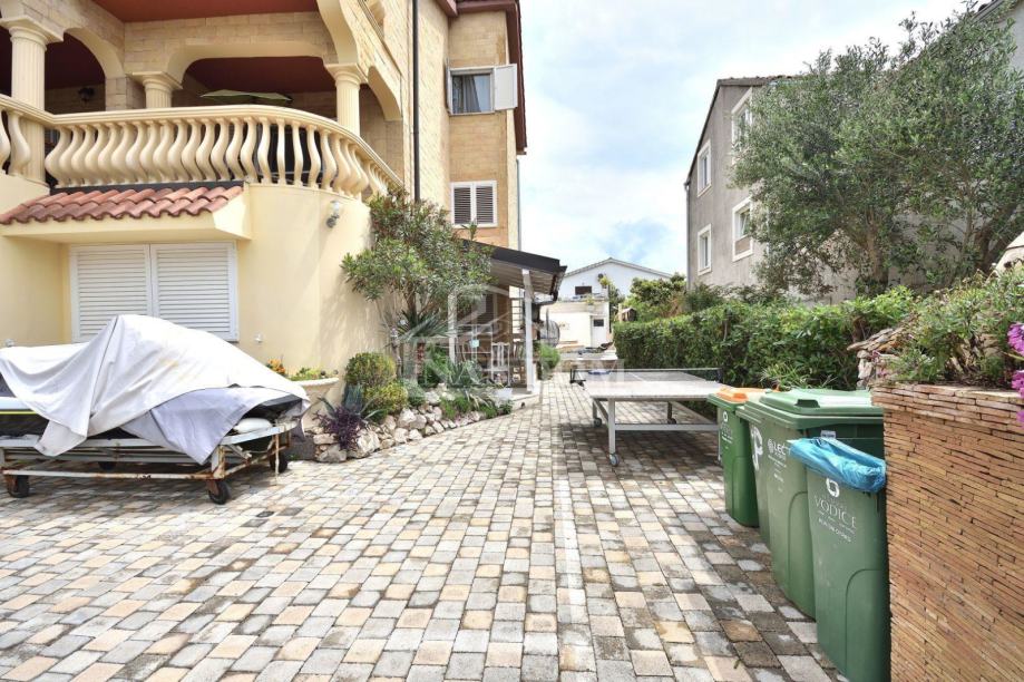 Vodice - prodaje se villa s 7 apartmana . Kuća građevinske bruto površine 538,52m2 sagrađena je 2011 g na zemljištu veličine 884m2. Uz kuću su sagrađene dvije pomoćne zgrade : ljetna kuhinja i wc ukupne tlocrtne površine 38,30m2 i garaža s spremištem ukupne tlocrne površine 39, 87m2. Garaža je preuređena i koristi se kao teretana, a krov garaže se koristi kao sunčalište na kojem su postavljene ležaljke za sunčanje. Kuća se koristi za dobro uhodani posao iznamljivanja u turizmu.