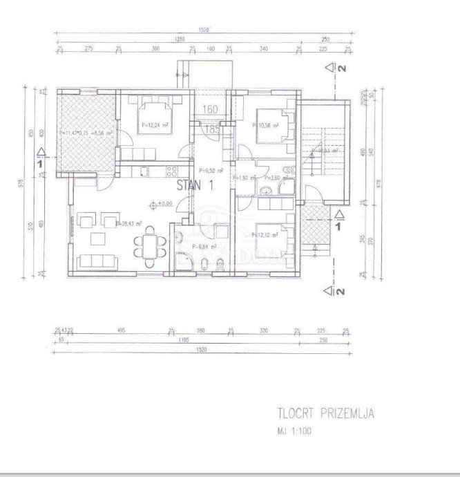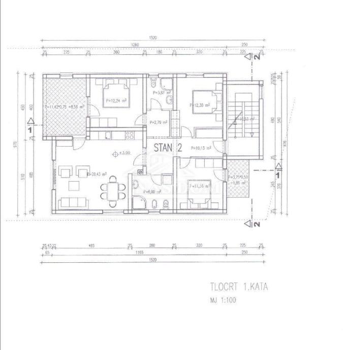 S2 stan se nalazi na katu kuće i sastoji se od: ulaz, hodnik , spavaća soba1, kupaonica1, spavaća soba2, kupaonica2, spavaća soba3, kuhinja s dnevnim boravkom i blagovaonicom i terasa, spremište u podrumu i vrt. Stanu pripadaju dva parkirna mjesta .Cijena:310.000€.