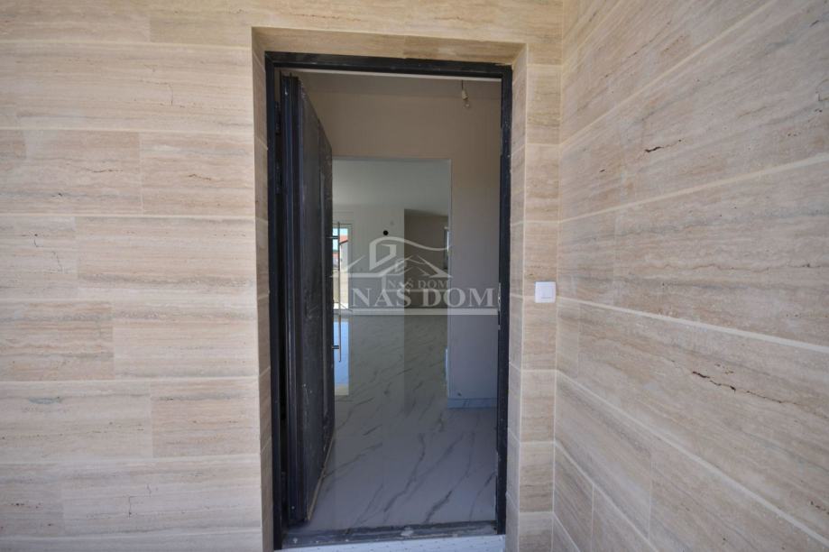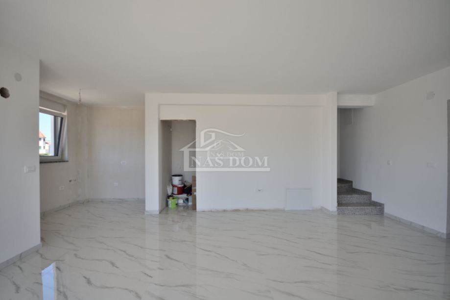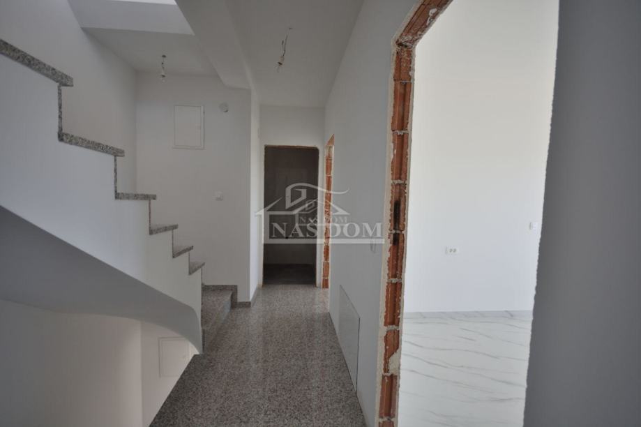 Prizemlje neto površine 60,81 m2 sastoji se od ulaz, predsoblje, kupaonica, tehnička soba ,ostava , kuhinja s blagavonicom i dnevni boravak . Unutarnjim stubištem se ide na kat kuće neto površine 62.08 m2 koji se sastoji od hodnika, kupaonice, dvije spavaće sobe i master spavaća soba s vlastitom kupaonicom i terasom . Unutarnjim stubištem se ide na II.kat neto površine 30,52 m2 koji se sastoji od hodnika , strojarnice, kuhinja, natkrivene terases instalacijama predviđene za jacuzzi i nenatkrivena terasa s koje se pruža pogled na more. Kući pripada i bazen , te odgovarajući dio vrta i dva parkirna mjesta.