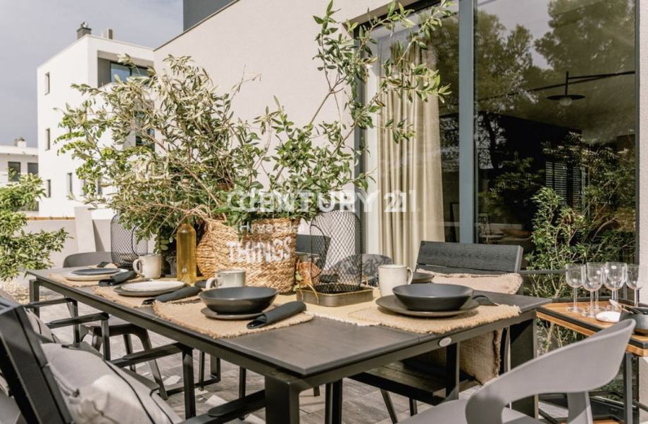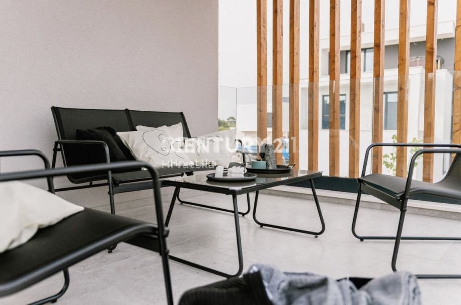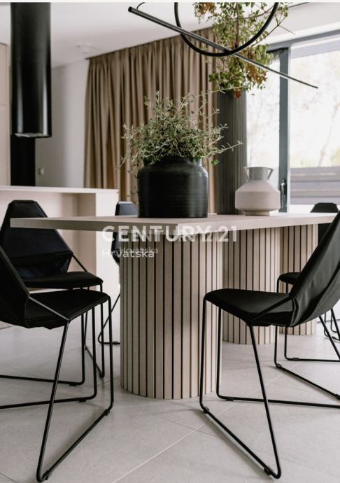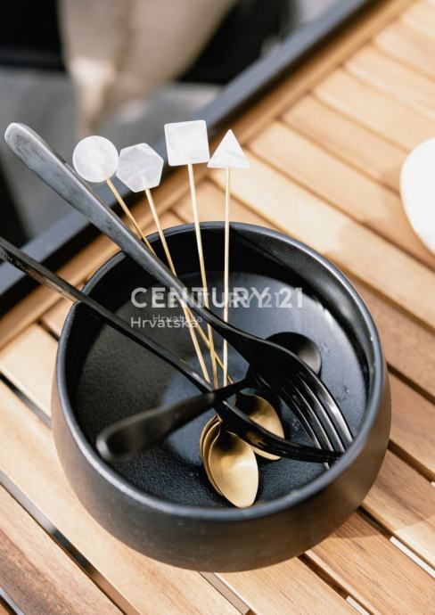 Prizemlje se sastoji od ulaznog hodnika, kuhinje sa blagovaonicom i dnevnim boravkom., spavaće sobe sa kupaonicom, toalet, te lijepe terase s koje se izlazi do dvorišta u kojem je smješten bazen od 40 m2.