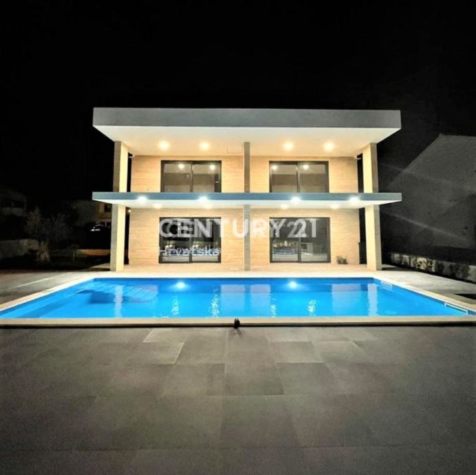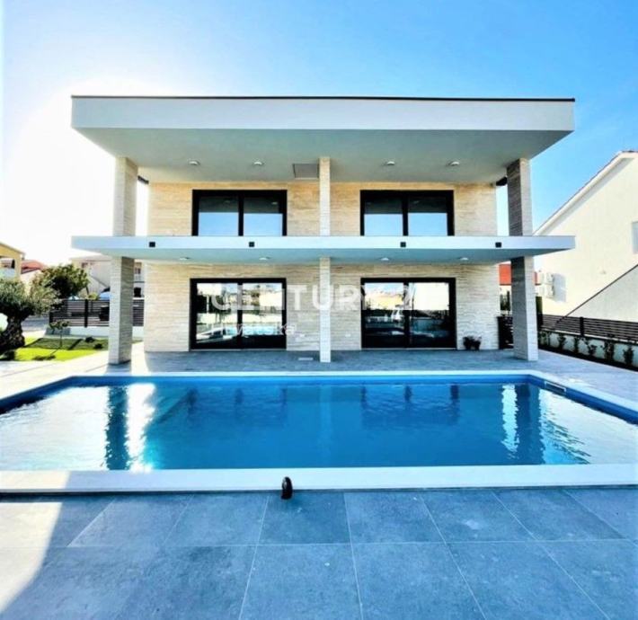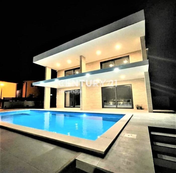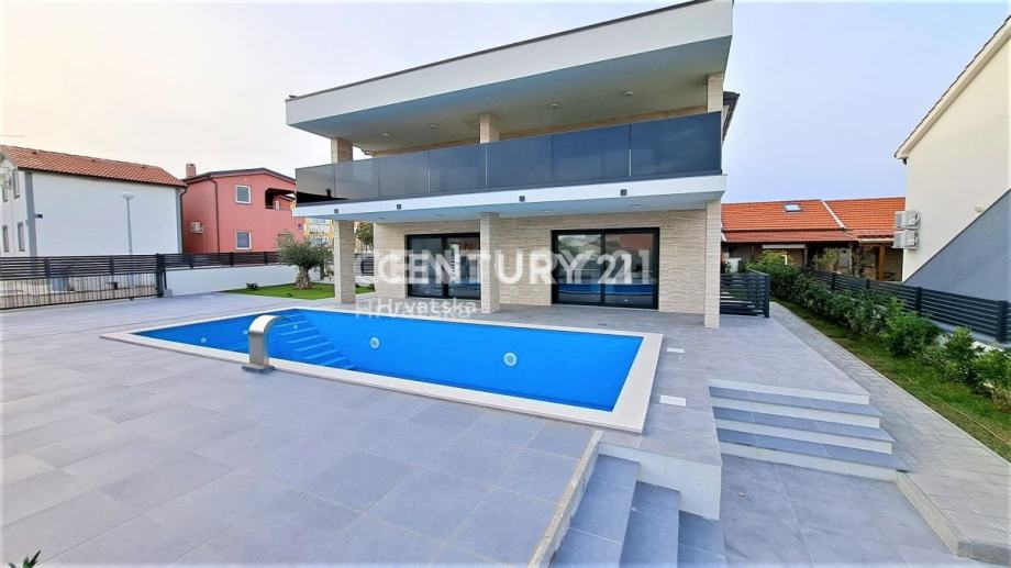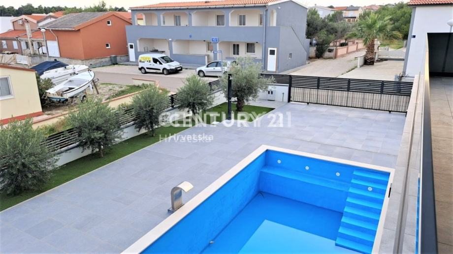 Prodaje se odlična novoizgrađena kuća s bazenom na otoku Viru, samo 100m od mora te s odličnim pogledom na more. Površina kuće je 257,65m2 te je izgrađena na zemljištu površine 553m2. Kuća se sastoji od podruma, prizemlja i prvog kata.