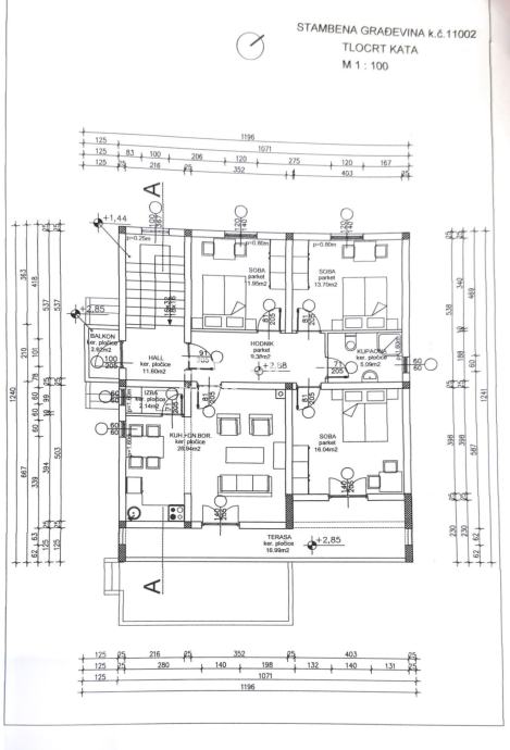 - Tri spavaće sobe (11,95 m2, 13,70 m2, 16,04 m2)