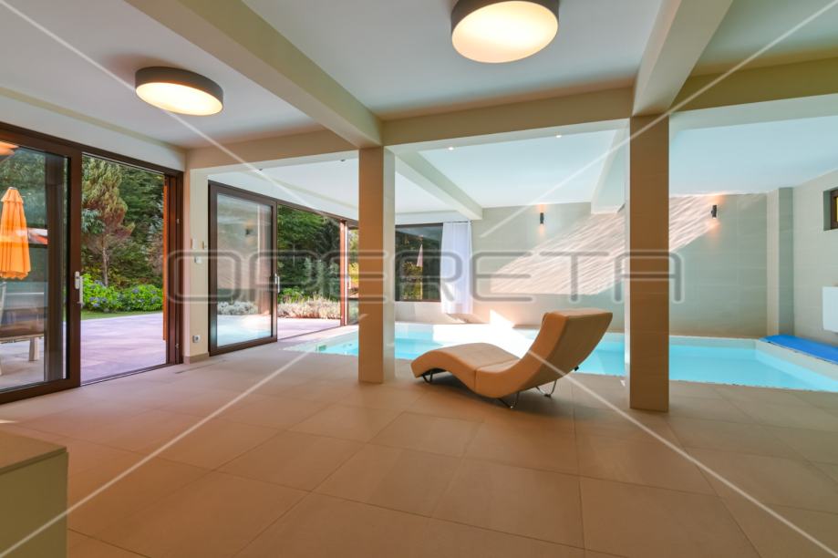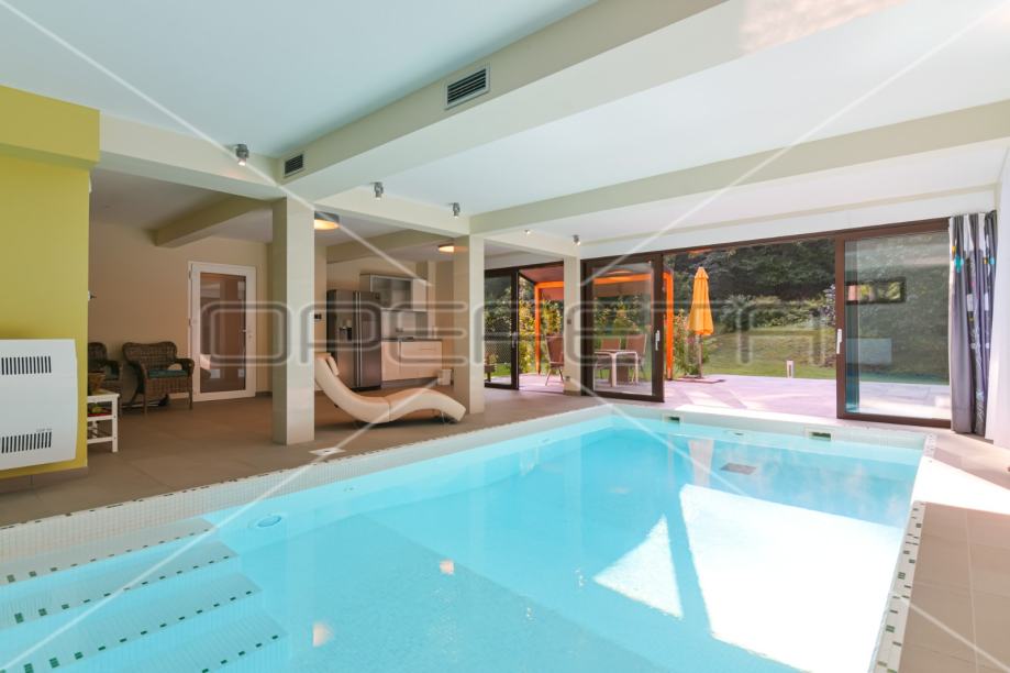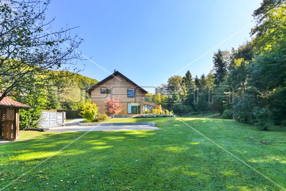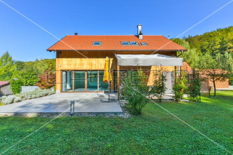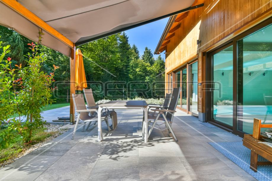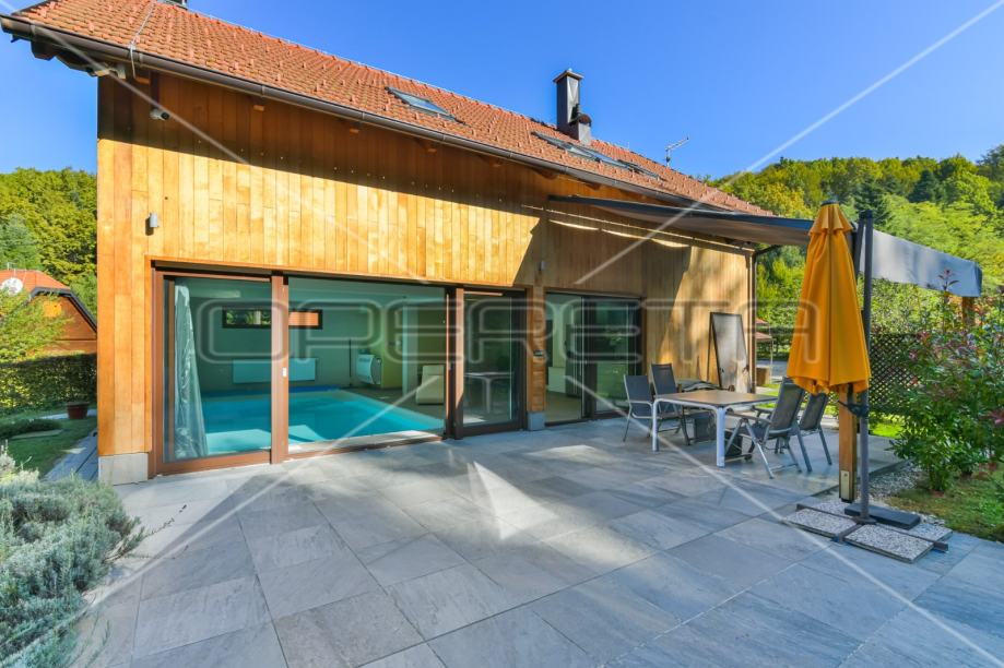 Moderna samostojeća vila od 264 m2 luksuznog interijera smještena na skrovitoj zelenoj oazi od 2130 m2. Razvedena je u tri etaže. U podrumskom prostoru nalazi se teretana, radna prostorija, hodnik i prostor tehnike bazena. Prizemljem prevladava bazen ( vrhunske izvedbe s protustrujnim plivanjem, slana voda) sa prostorom za opuštanje koji je putem kliznih stijena i vanjskih terasa u direktnom kontaktu s prirodom i šumovitim okruženjem, te wc + tuš i mini kuhinja. Na katu se nalaze 2 spavaće sobe s vlastitim kupaonicama te "open space" dnevni boravak s kuhinjom i blagovaonicom. Vrhunski namještaj i oprema uključujući alarm, video-nadzor, rolete na daljinsko upravljanje, auto-zatvaranje krovnih prozora u slučaju kiše itd.. Vila je armirano-betonske konstrukcije obložena drvetom ( hrast ) koji i obilježava okruženje u kojem se nalazi. 2 pomoćna objekta: garaža i spremište te parking. Idealna planinska mikroklima. Vila je kategorizirana s 4* i ima izvrsnu i konstantnu popunjenost. Prodaje se potpuno namještena i spremna za nastavak iznajmljivanja. Besprijekoran luksuz i odmor u čistoj prirodi!