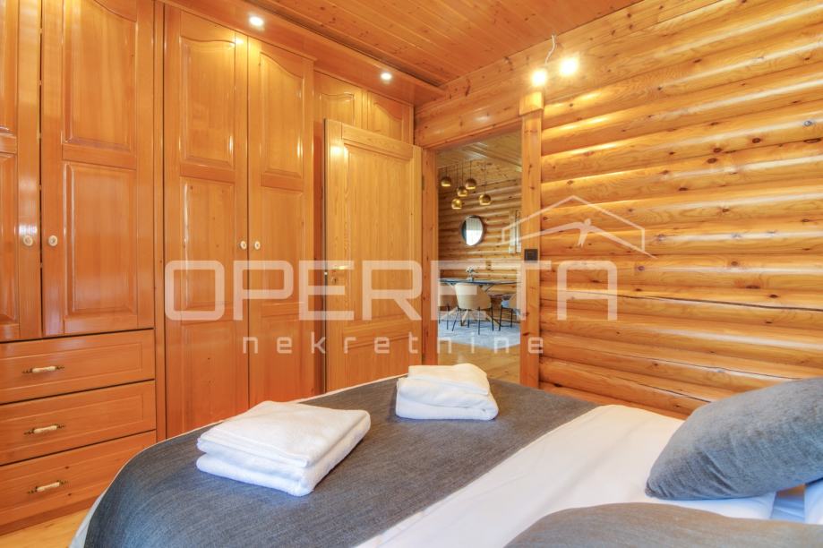 Kuća (150m2) se sastoji od podruma gdje je smješten mini wellness s jaccuzijem i saunom te prostorom za odmor, kupaonicom i čajnom kuhinjom.