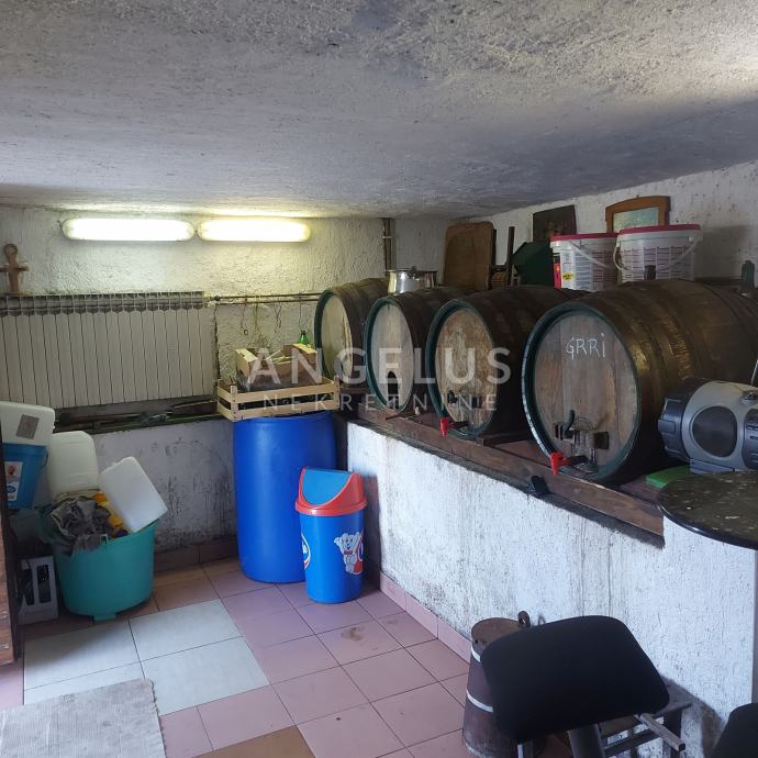 Podrum je grijan i veličine cca 20 m2 iz kojeg se izlazi na prostrano dvorište na kojem se nalazi zidani roštilj, dvorišna kućica koja služi kao spremište, radiona i nadstrešnica.