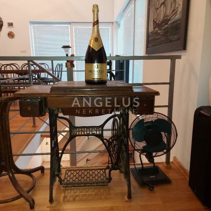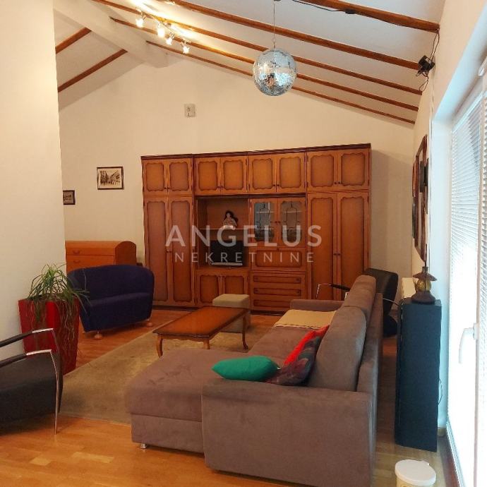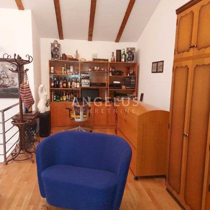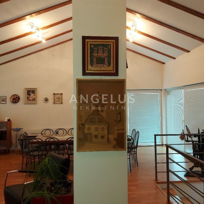 Kružnim stepenicama napravljenim od drva oraha se dolazi na kat kuće koji se sastoji od velikog open space boravka koji je cijeli u parketu a iz kojeg se izlazi na sjeverno - istočni balkon kroz peterovratnu staklenu stijenu s pogledom na ulicu i okolne kuće te na zapadni balkon kroz dvovratnu staklenu stijenu iz koje se pruža prekrasan pogled na Samobor, Breganu, Dvorac Mokrice i Zaprešić. Ovaj dio kuće ima za novog kupca ogroman potencijal za eventualno preuređenje u stan ili sobe za spavanje.